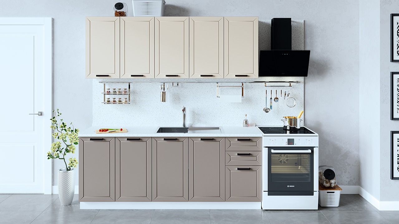 | Габаритный размер набора модулей без учета газовой плиты2 000 | Оттенок фасадаБежевый, Коричневый | Цвет ручкиЧерный |