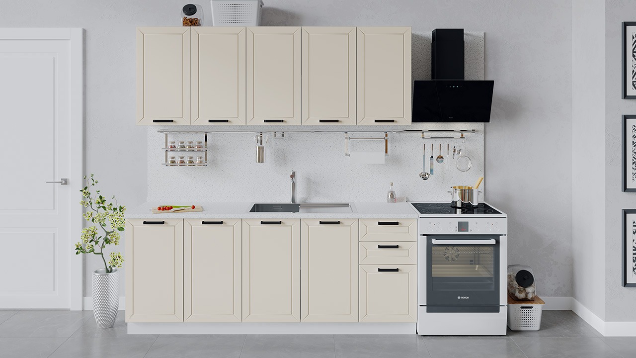 | Габаритный размер набора модулей без учета газовой плиты2 000 | Оттенок фасадаБежевый | Цвет ручкиЧерный |