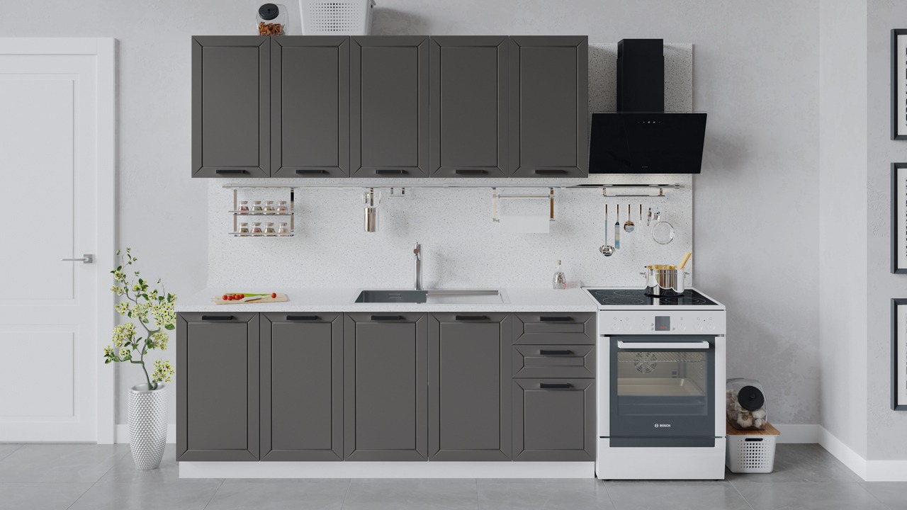 | Габаритный размер набора модулей без учета газовой плиты2 000 | Оттенок фасадаСерый | Цвет ручкиЧерный |