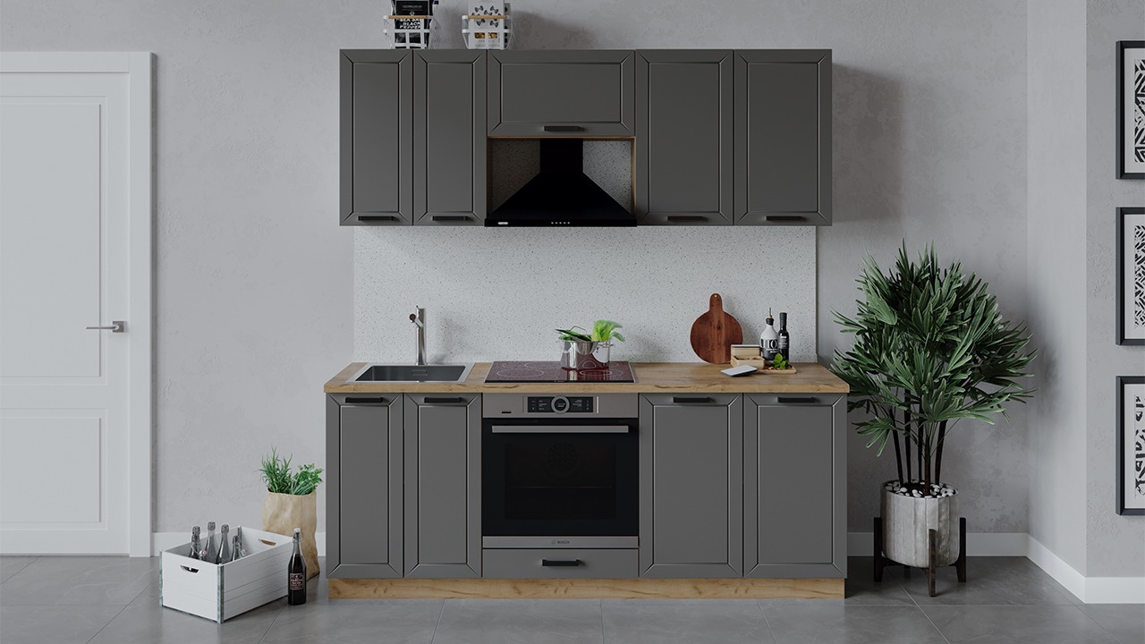 | Габаритный размер набора модулей без учета газовой плиты2 000 | Оттенок фасадаСерый | Цвет ручкиЧерный |