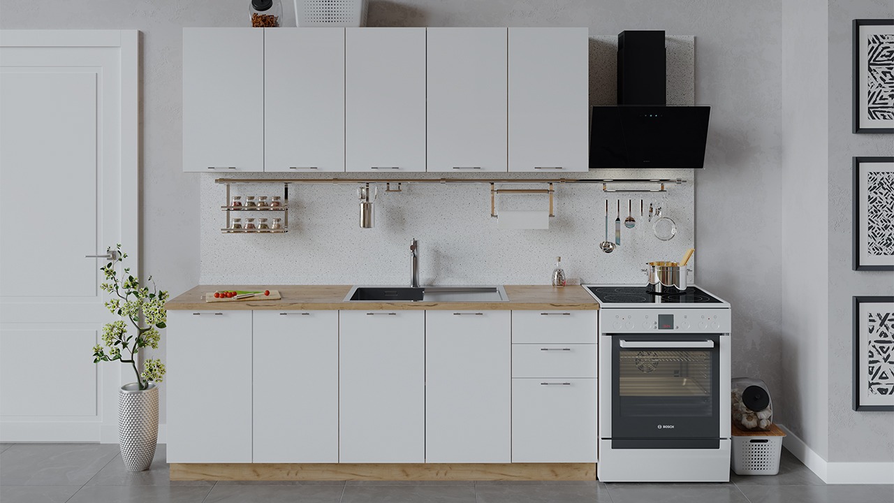 | Габаритный размер набора модулей без учета газовой плиты2 000 | Оттенок фасадаБелый | Цвет ручкиАлюминий, Хром |