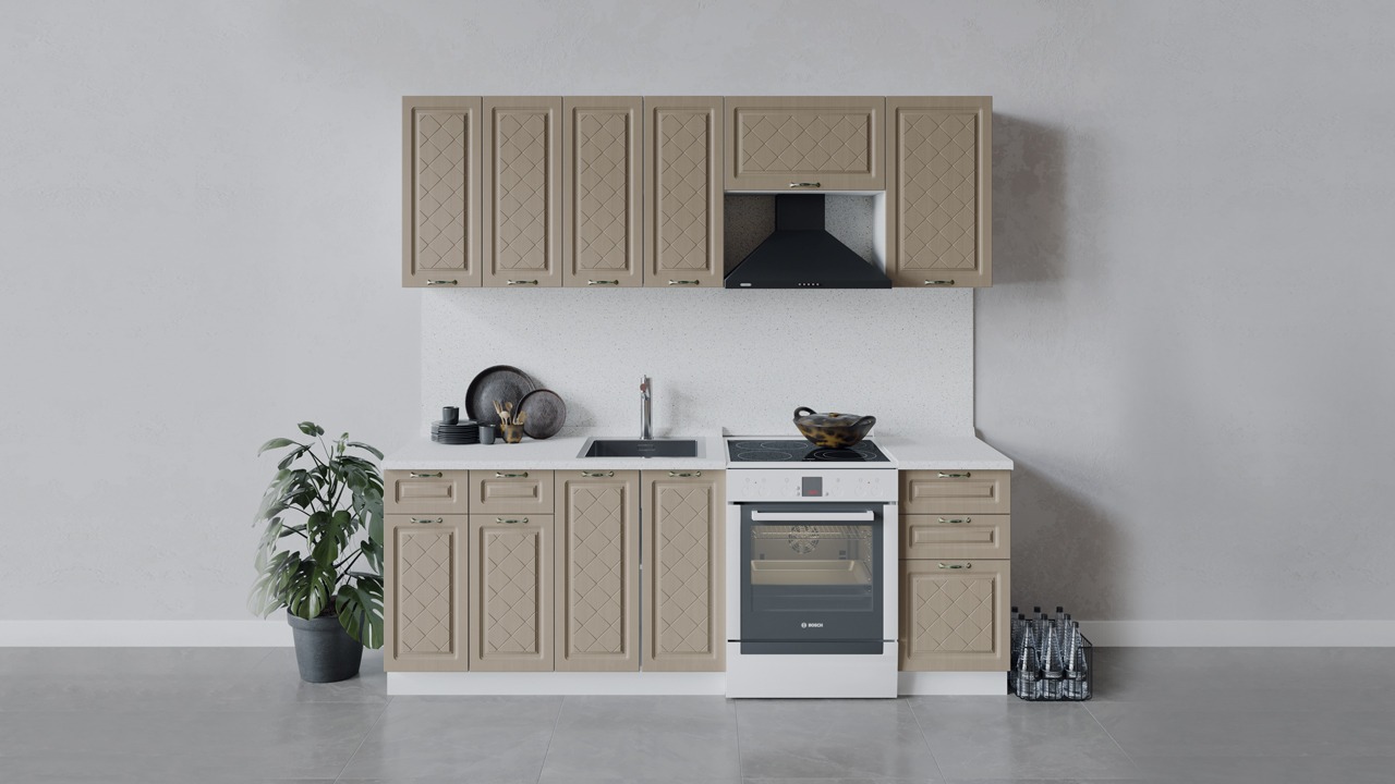 | Габаритный размер набора модулей без учета газовой плиты2 200 | Оттенок фасадаКоричневый | Цвет ручкиБрашированная старинная бронза |