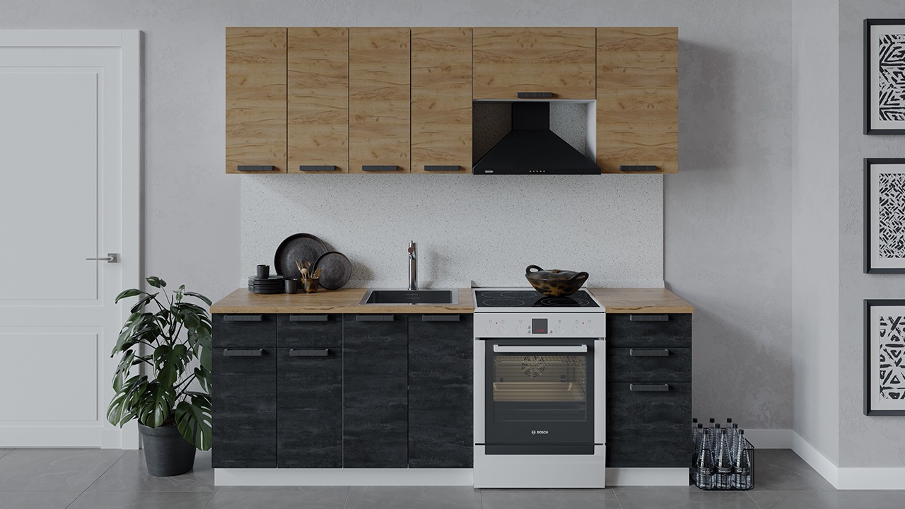 | Габаритный размер набора модулей без учета газовой плиты2 200 | Оттенок фасадаКоричневый, Черный | Цвет ручкиЧерный |