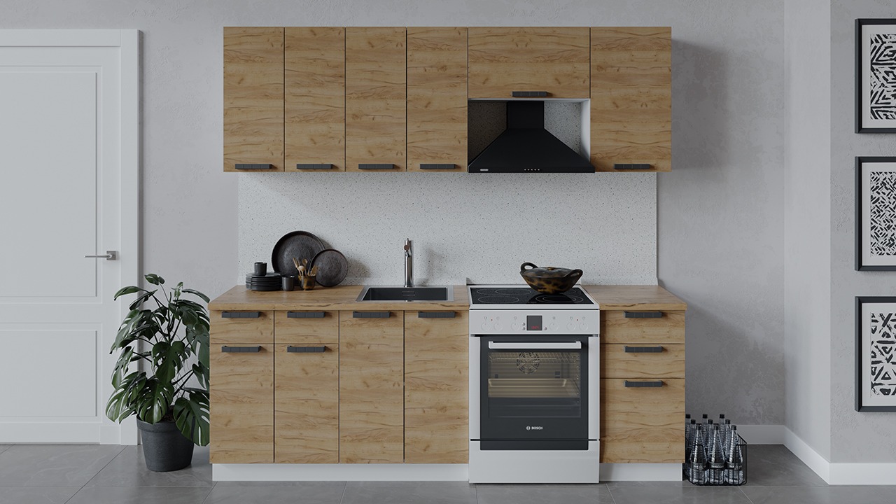 | Габаритный размер набора модулей без учета газовой плиты2 200 | Оттенок фасадаКоричневый | Цвет ручкиЧерный |