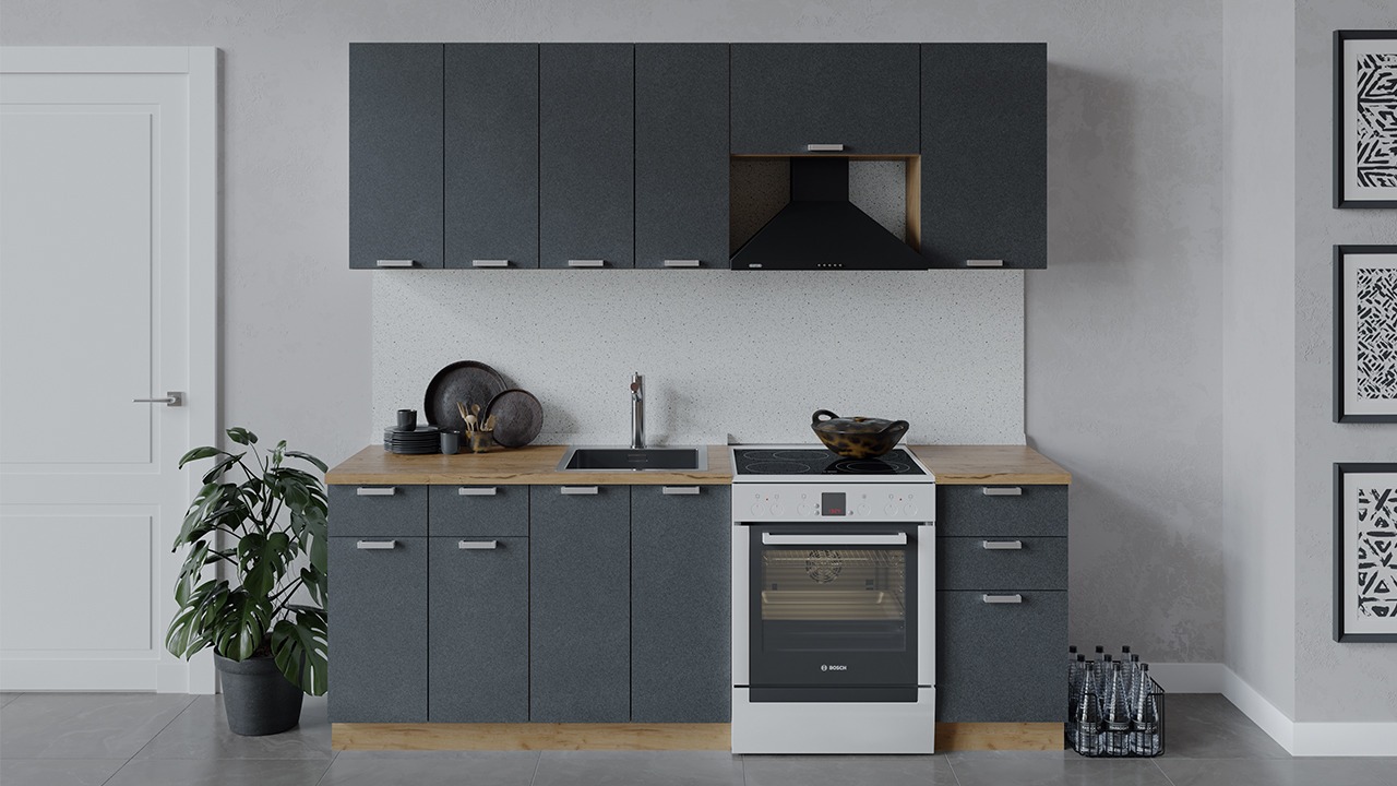 | Габаритный размер набора модулей без учета газовой плиты2 200 | Оттенок фасадаСерый | Цвет ручкиАлюминий |