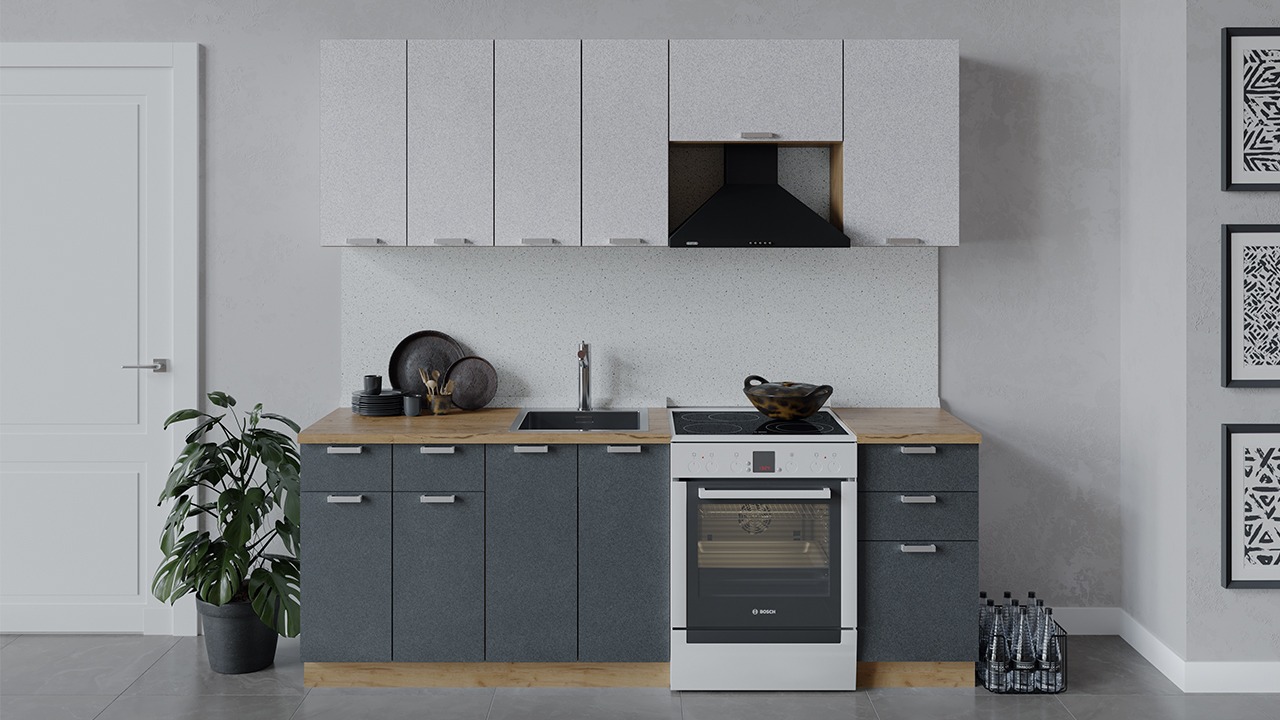 | Габаритный размер набора модулей без учета газовой плиты2 200 | Оттенок фасадаСерый | Цвет ручкиАлюминий |