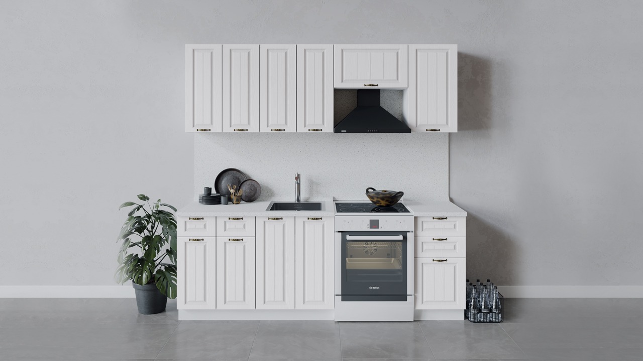 | Габаритный размер набора модулей без учета газовой плиты2 200 | Оттенок фасадаБелый | Цвет ручкиБрашированная старинная бронза |