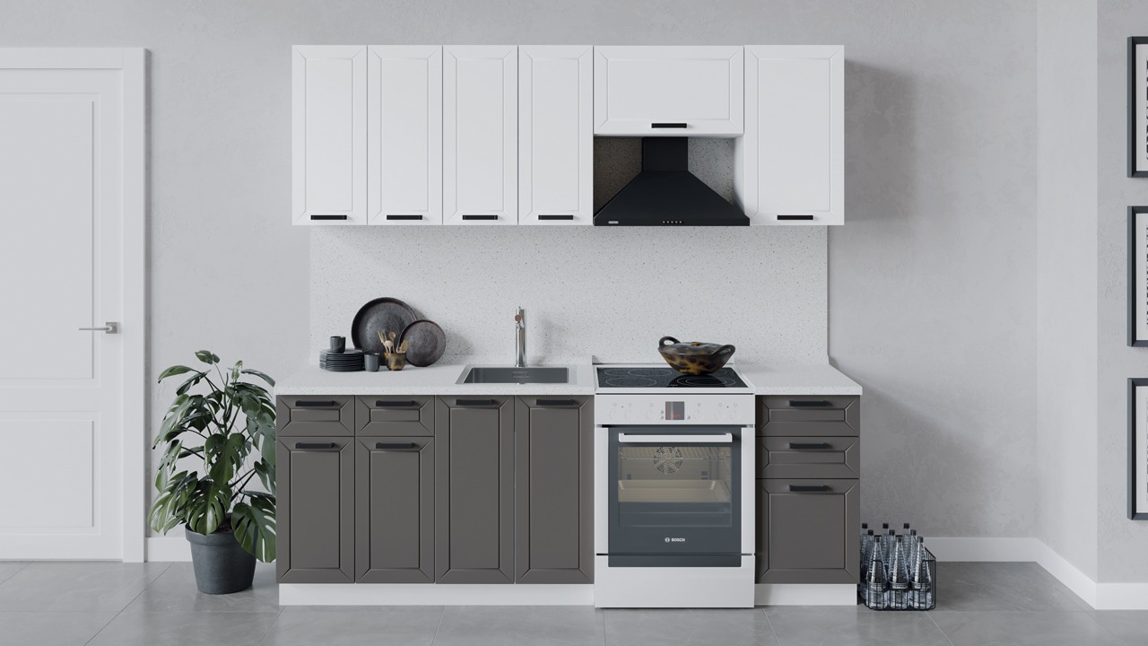 | Габаритный размер набора модулей без учета газовой плиты2 200 | Оттенок фасадаБелый, Серый | Цвет ручкиЧерный |