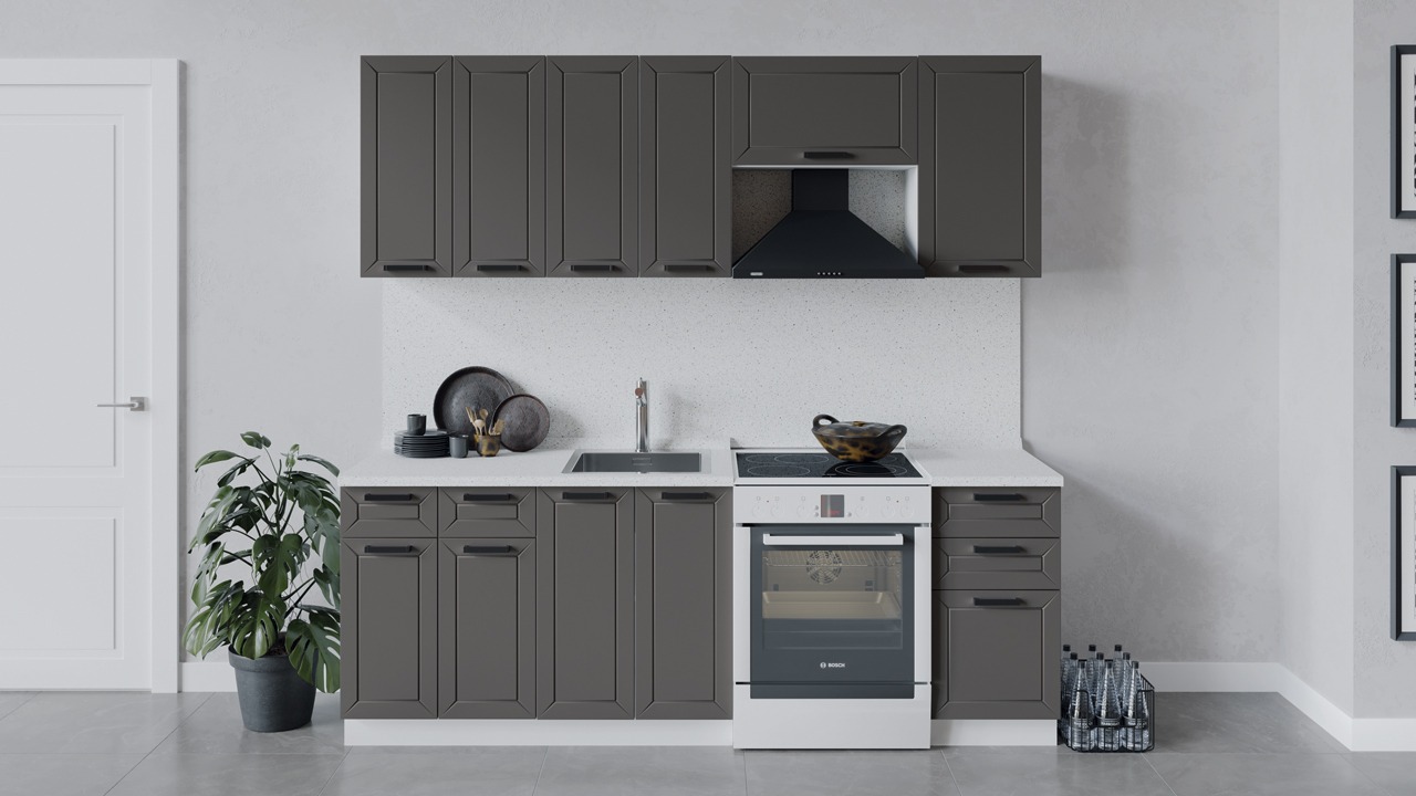 | Габаритный размер набора модулей без учета газовой плиты2 200 | Оттенок фасадаСерый | Цвет ручкиЧерный |