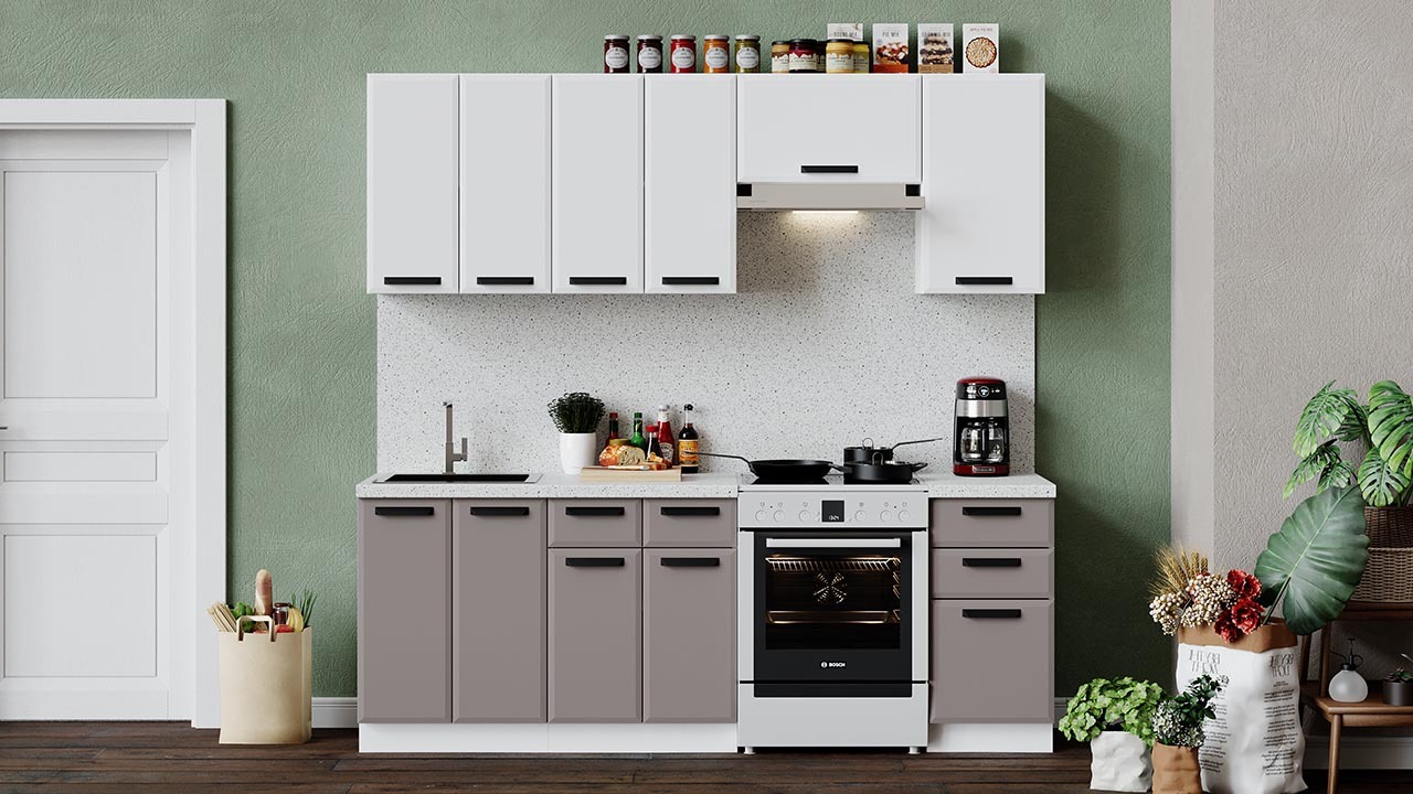 | Габаритный размер набора модулей без учета газовой плиты2 200 | Оттенок фасадаБелый, Коричневый | Цвет фасадаБелый супермат, Мокко супермат |