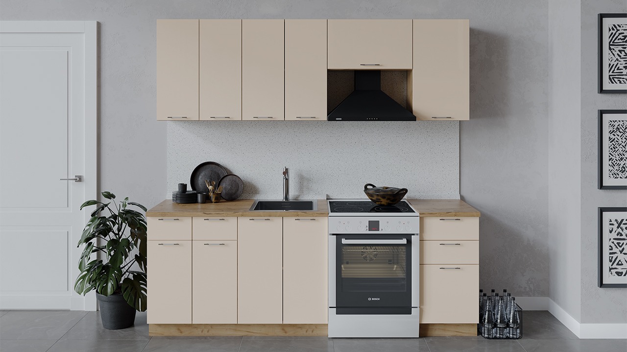 | Габаритный размер набора модулей без учета газовой плиты2 200 | Оттенок фасадаБежевый | Цвет ручкиАлюминий, Хром |