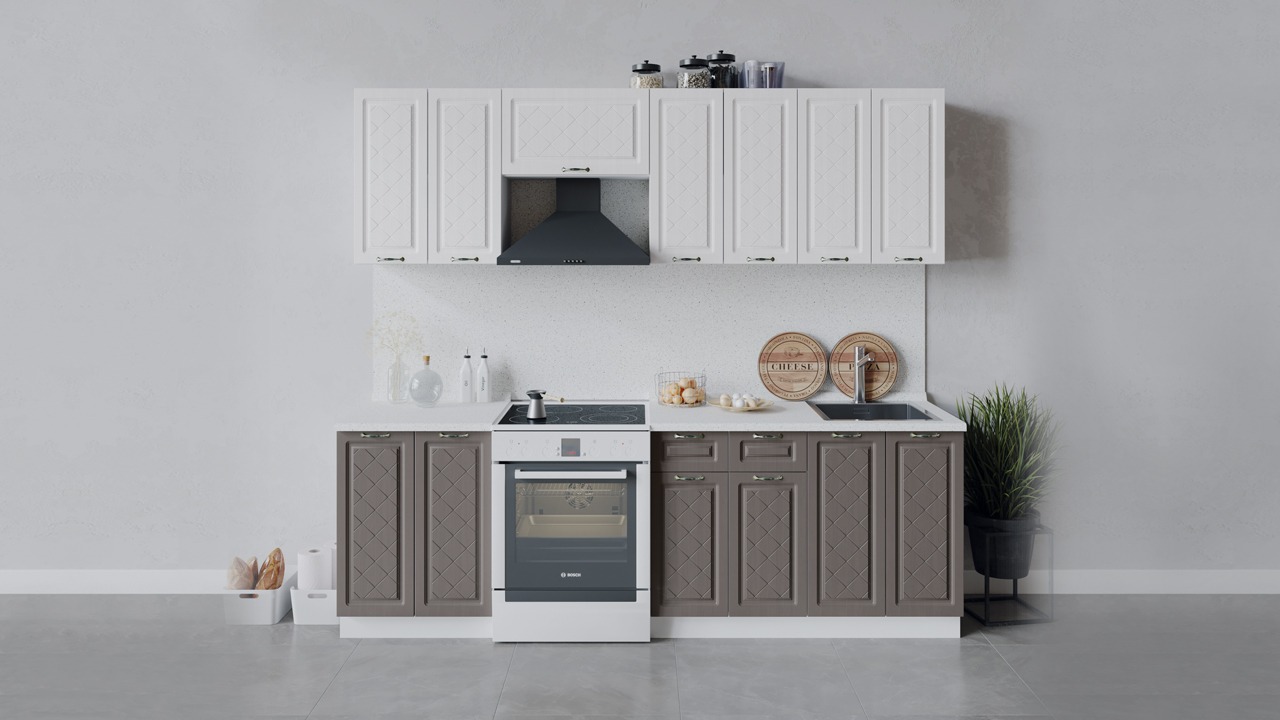 | Габаритный размер набора модулей без учета газовой плиты2 400 | Оттенок фасадаБелый, Серый | Цвет ручкиБрашированная старинная бронза |