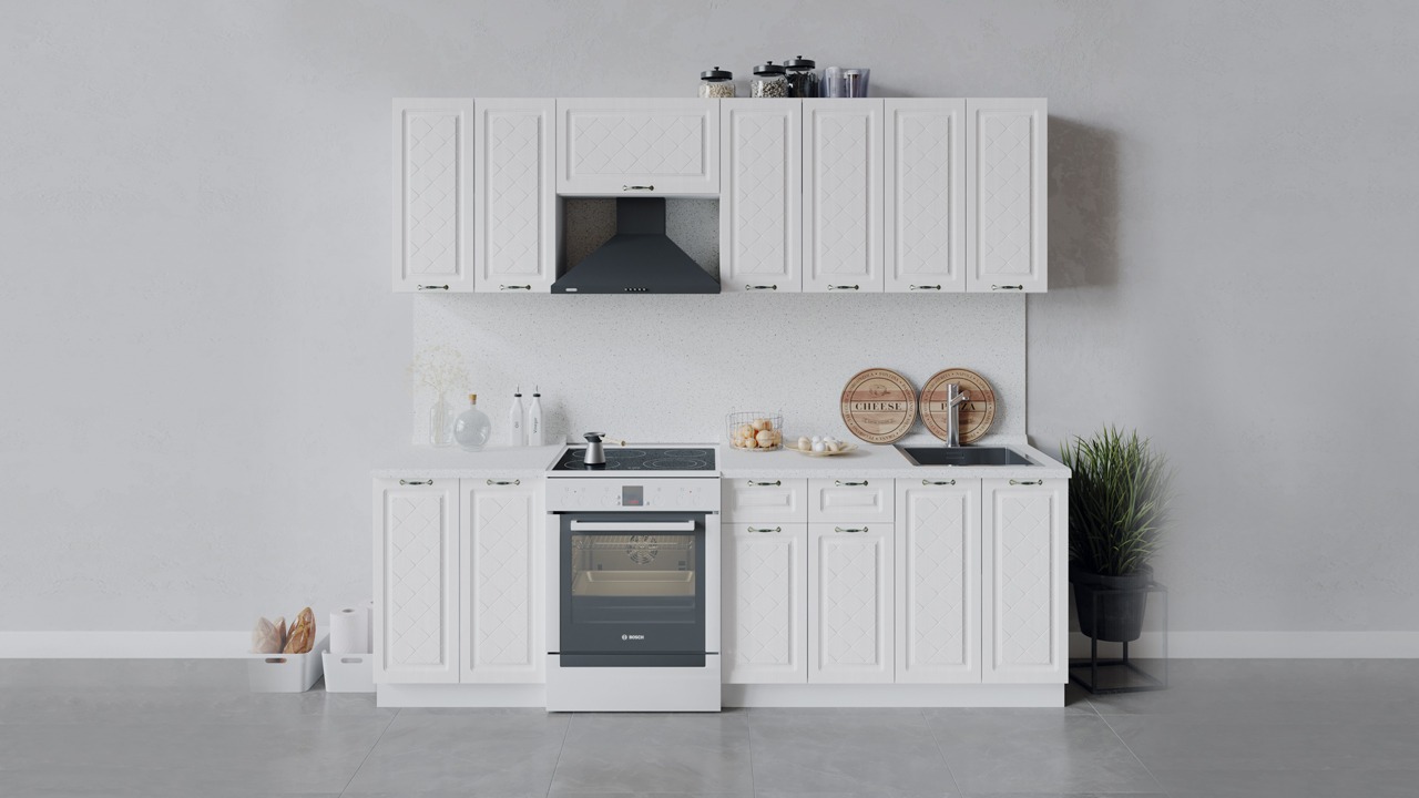 | Габаритный размер набора модулей без учета газовой плиты2 400 | Оттенок фасадаБелый | Цвет ручкиБрашированная старинная бронза |