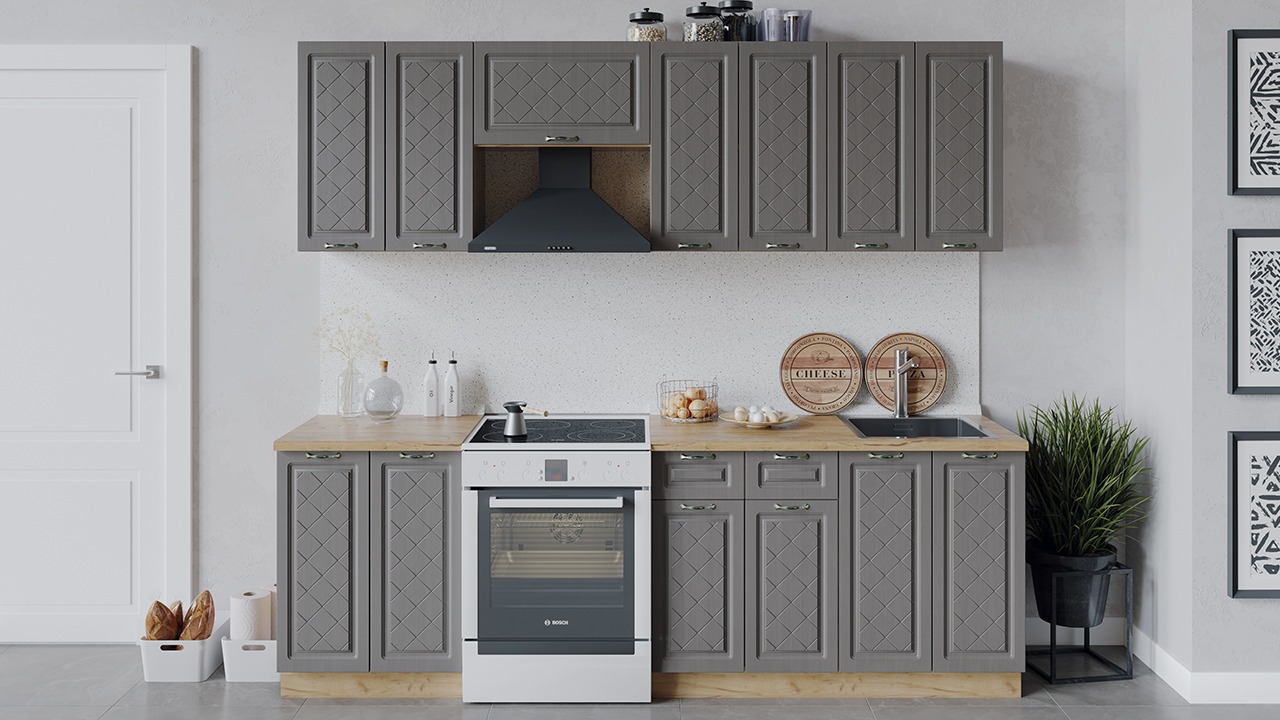 | Габаритный размер набора модулей без учета газовой плиты2 400 | Оттенок фасадаСерый | Цвет ручкиБрашированная старинная бронза |