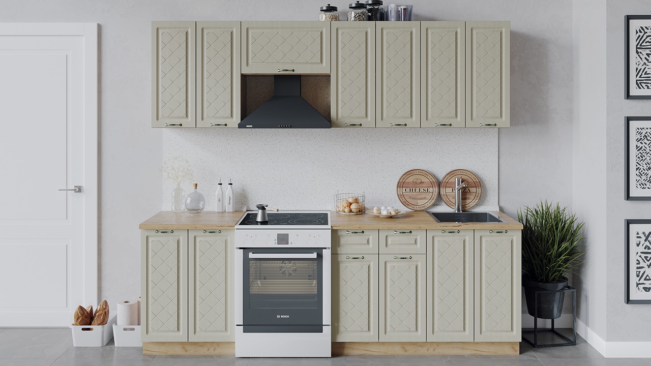 | Габаритный размер набора модулей без учета газовой плиты2 400 | Оттенок фасадаБежевый | Цвет ручкиБрашированная старинная бронза |