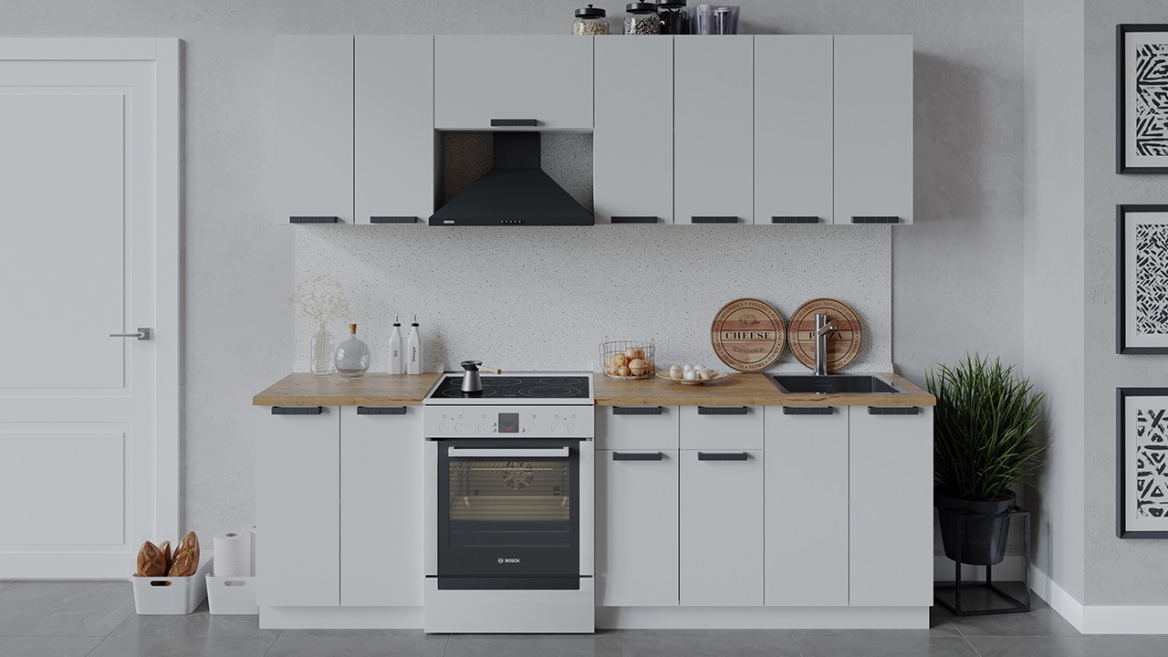 | Габаритный размер набора модулей без учета газовой плиты2 400 | Оттенок фасадаБелый | Цвет ручкиЧерный |