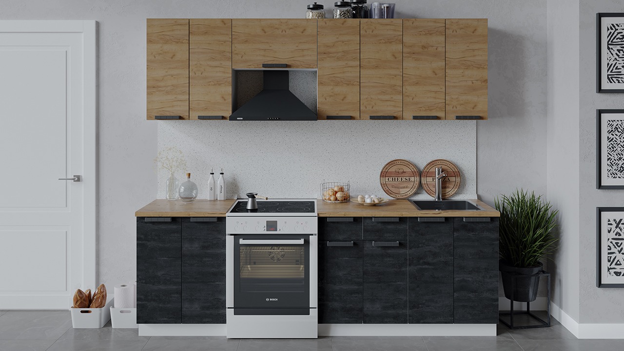 | Габаритный размер набора модулей без учета газовой плиты2 400 | Оттенок фасадаКоричневый, Черный | Цвет ручкиЧерный |