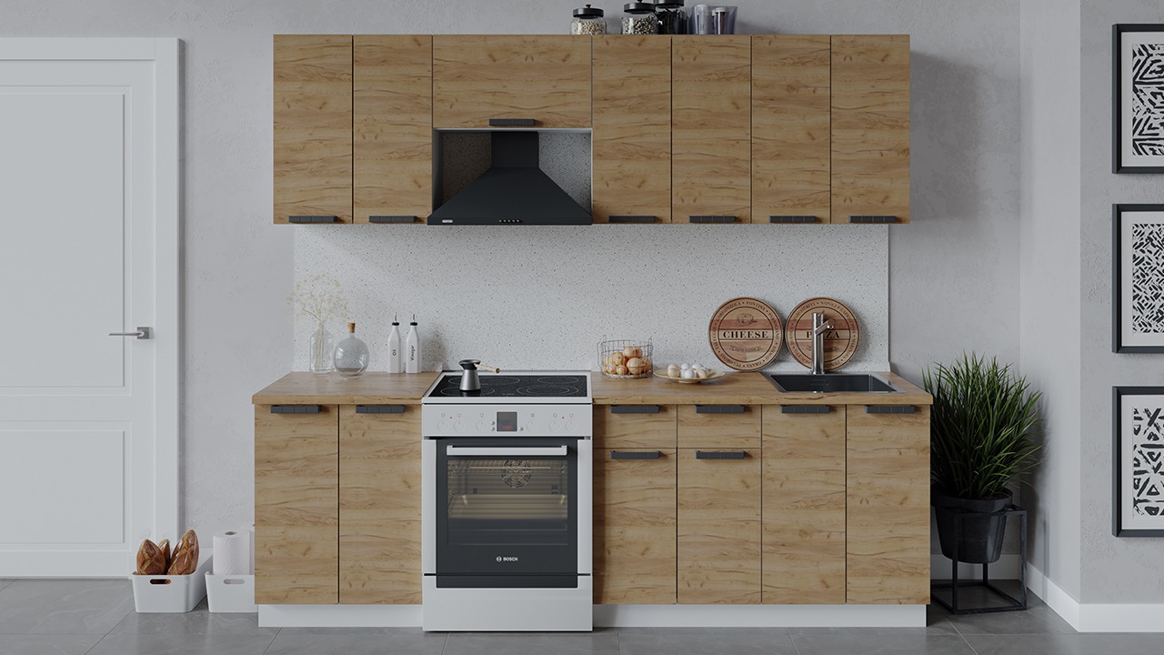 | Габаритный размер набора модулей без учета газовой плиты2 400 | Оттенок фасадаКоричневый | Цвет ручкиЧерный |