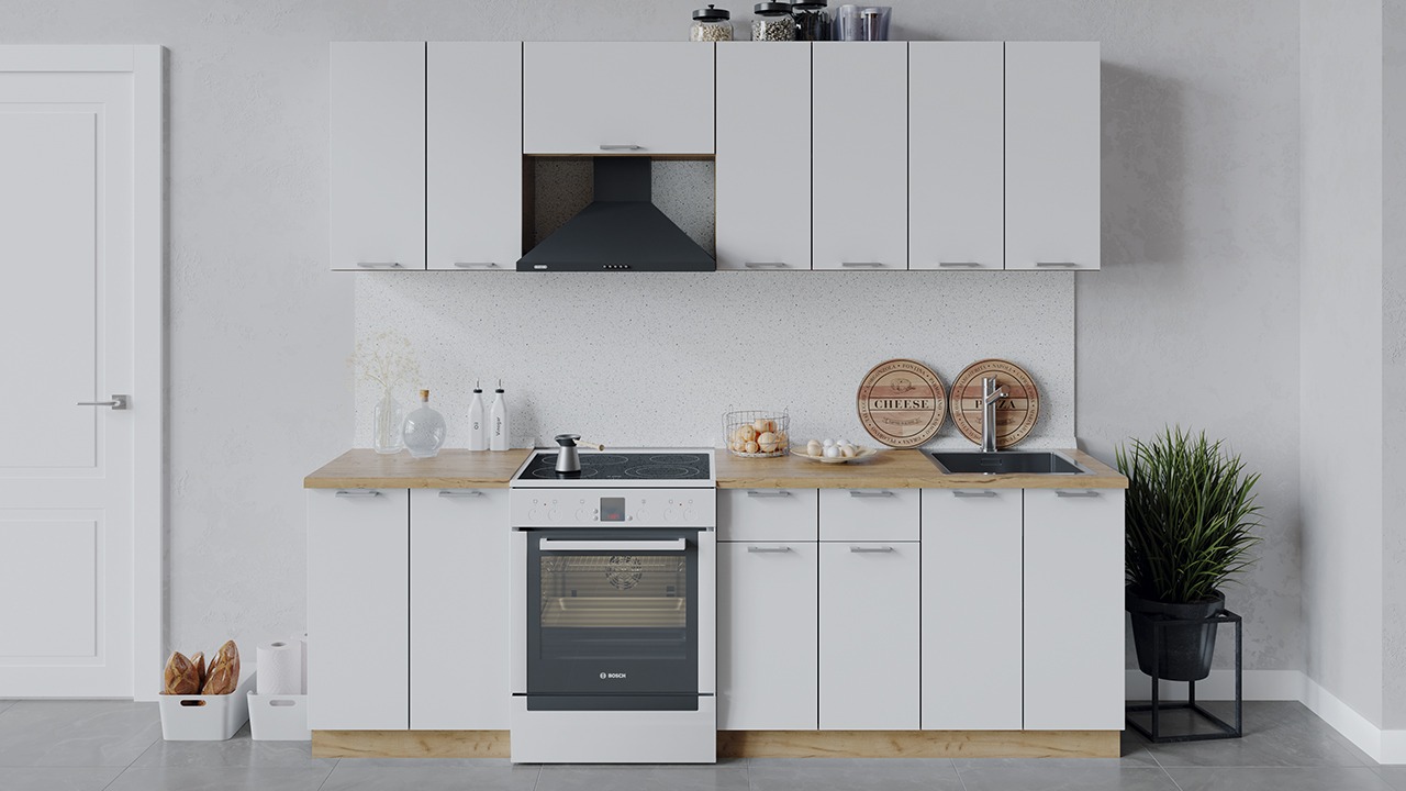 | Габаритный размер набора модулей без учета газовой плиты2 400 | Оттенок фасадаБелый | Цвет ручкиМеталл |