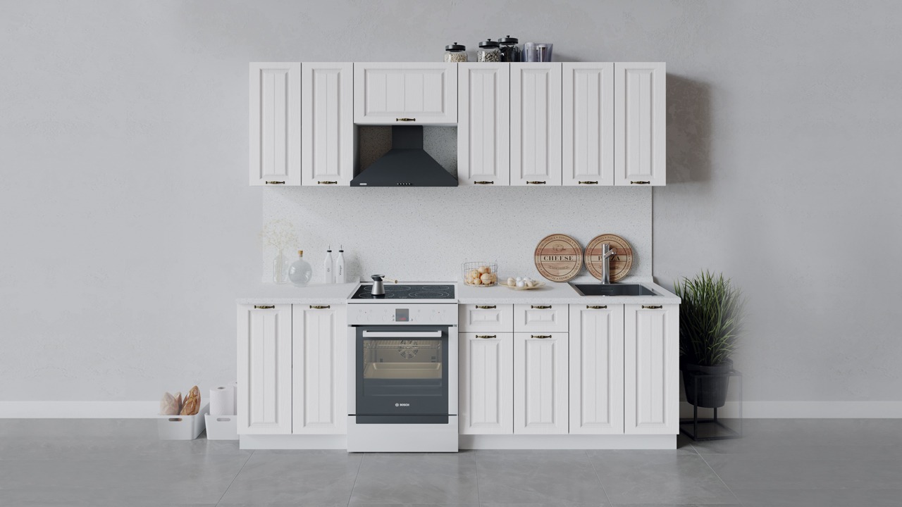 | Габаритный размер набора модулей без учета газовой плиты2 400 | Оттенок фасадаБелый | Цвет ручкиБрашированная старинная бронза |