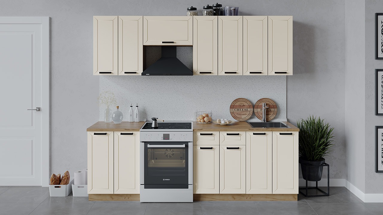 | Габаритный размер набора модулей без учета газовой плиты2 400 | Оттенок фасадаБежевый | Цвет ручкиЧерный |