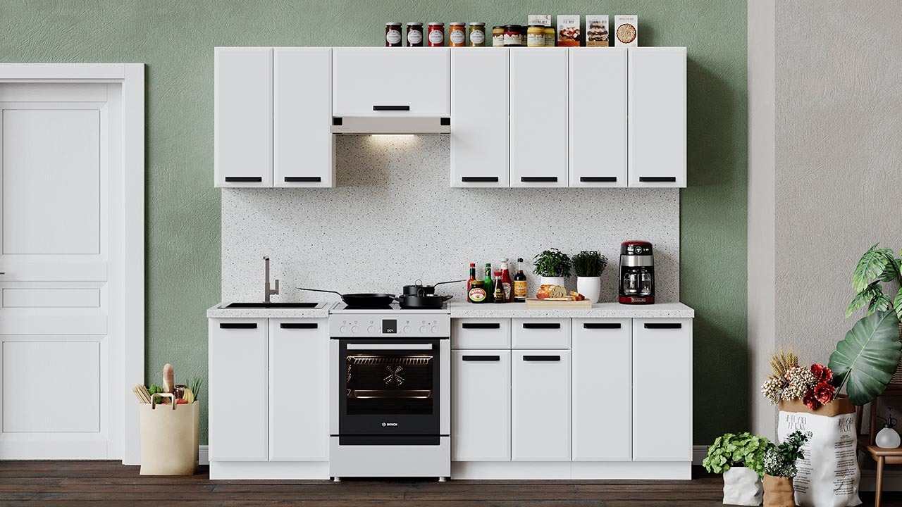 | Габаритный размер набора модулей без учета газовой плиты2 400 | Оттенок фасадаБелый | Цвет фасадаБелый супермат |