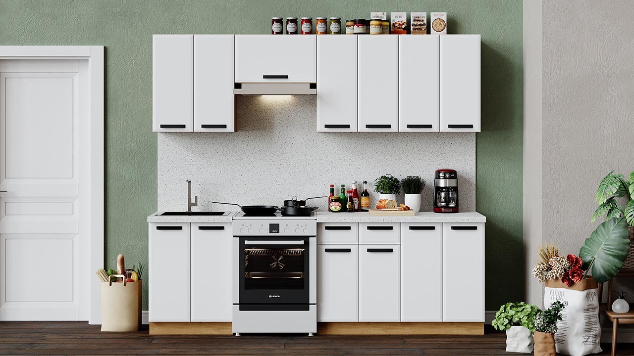 | Габаритный размер набора модулей без учета газовой плиты2 400 | Оттенок фасадаБелый | Цвет фасадаБелый супермат |