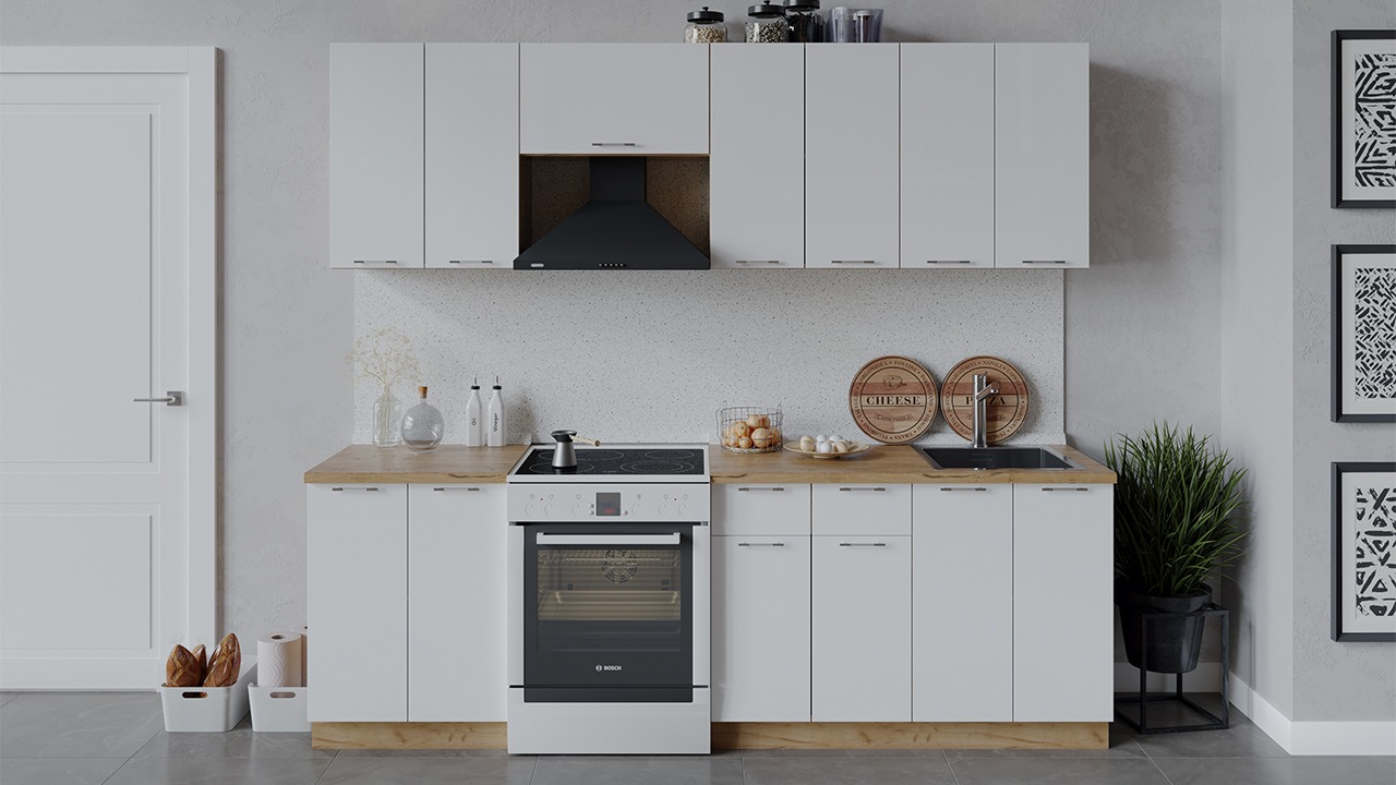 | Габаритный размер набора модулей без учета газовой плиты2 400 | Оттенок фасадаБелый | Цвет ручкиАлюминий, Хром |