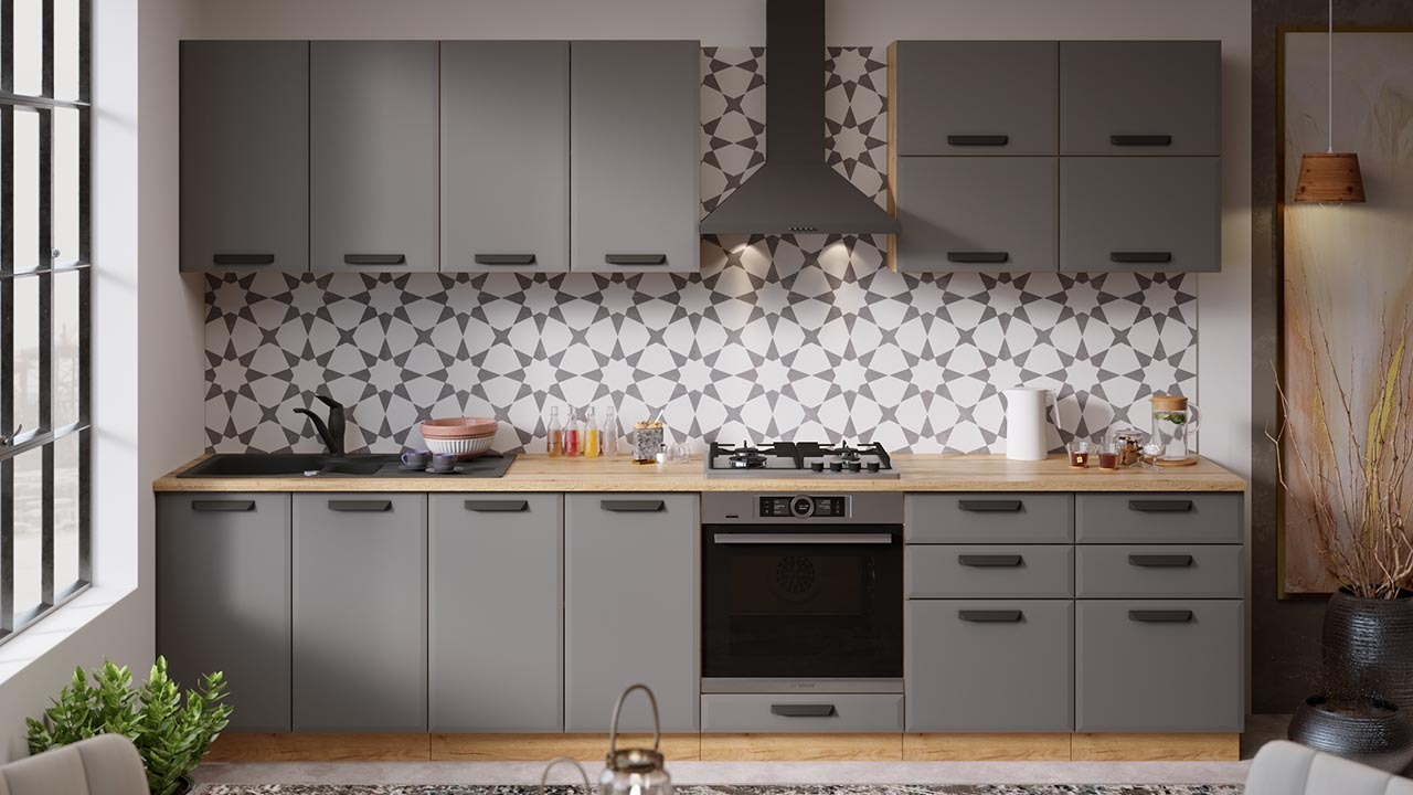 | Материал фасадаМДФ, пленка ПВХ | ЦветДуб Крафт золотой, Асфальт супермат | Комната использованияКухня |