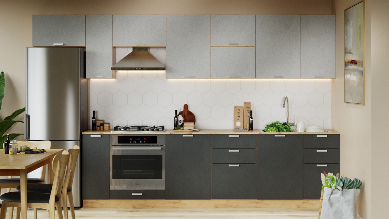 | Габаритный размер набора модулей без учета газовой плиты3 400 | Оттенок фасадаСерый | Цвет ручкиАлюминий |
