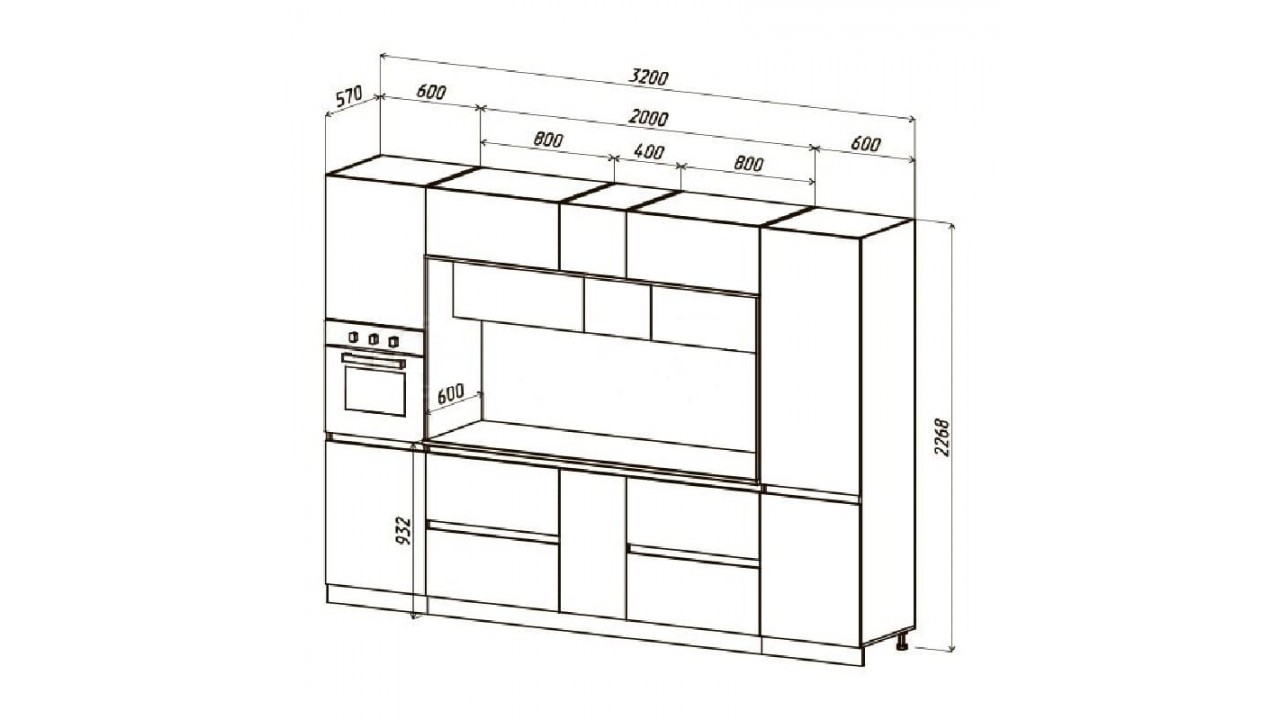 | Габаритная глубина напольных шкафов без столешницы490 | Габаритная глубина напольных шкафов с учетом столешницы600 | Габаритная длина3200 |