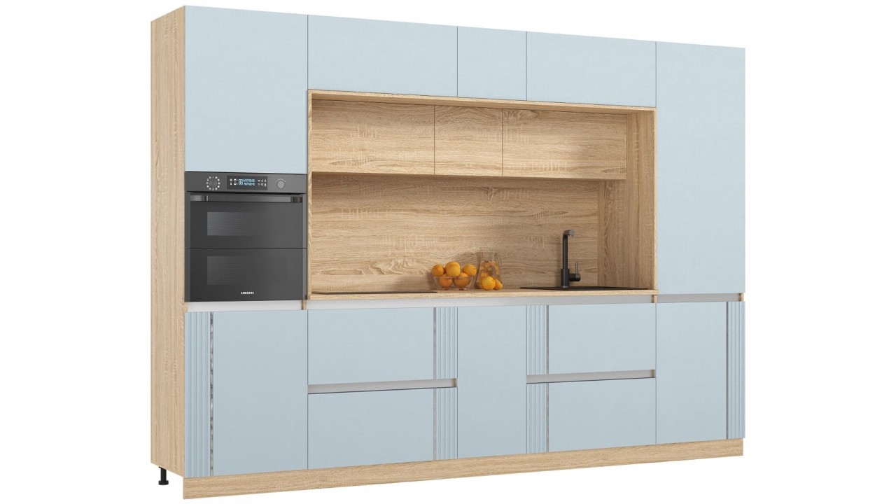 | Габаритная высота навесных шкафов768 мм (внутренняя высота 360 + 360 мм) | Габаритная высота напольных шкафов с учетом столешницы и ножек850 | Габаритная глубина навесных шкафов300 |