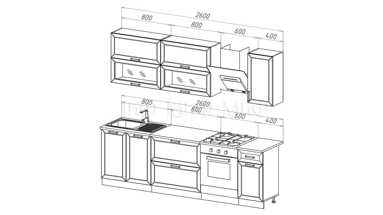 | Габаритная глубина напольных шкафов без столешницы445 | Габаритная глубина напольных шкафов с учетом столешницы600 | Габаритная длина2600 |