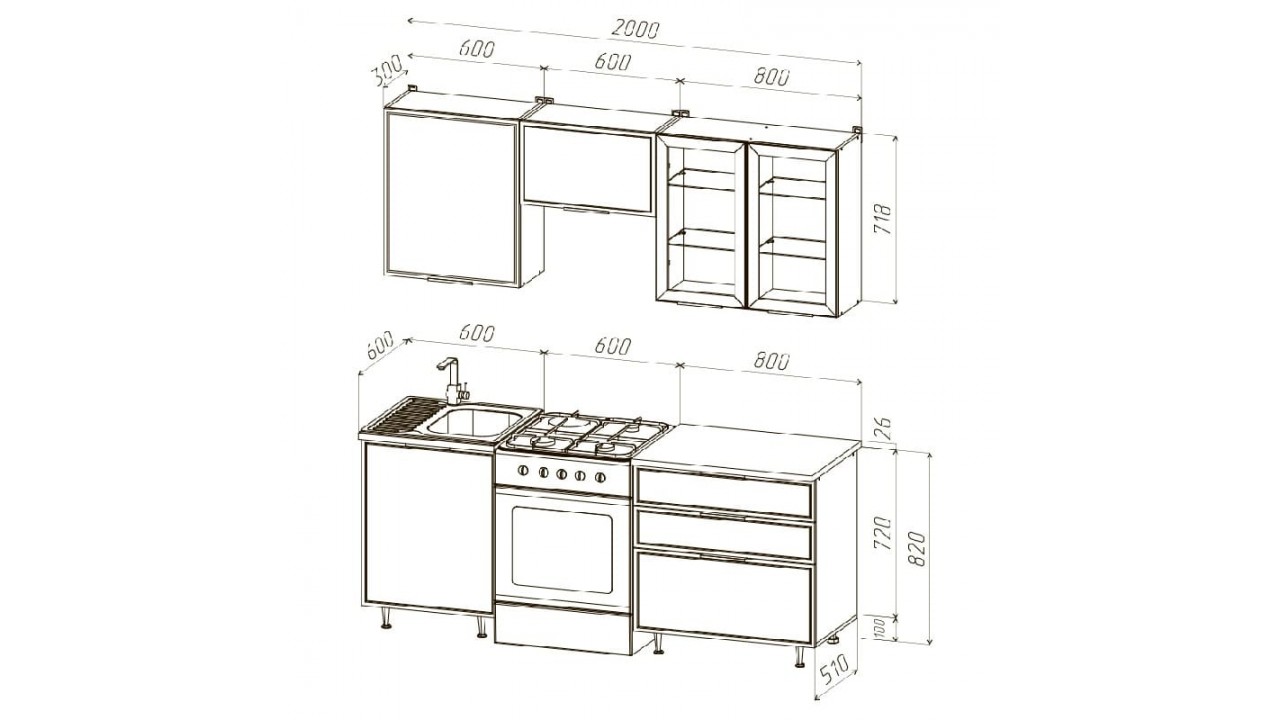 | Габаритная высота навесных шкафов718 | Габаритная высота напольных шкафов с учетом столешницы и ножек850 | Габаритная глубина навесных шкафов300 |