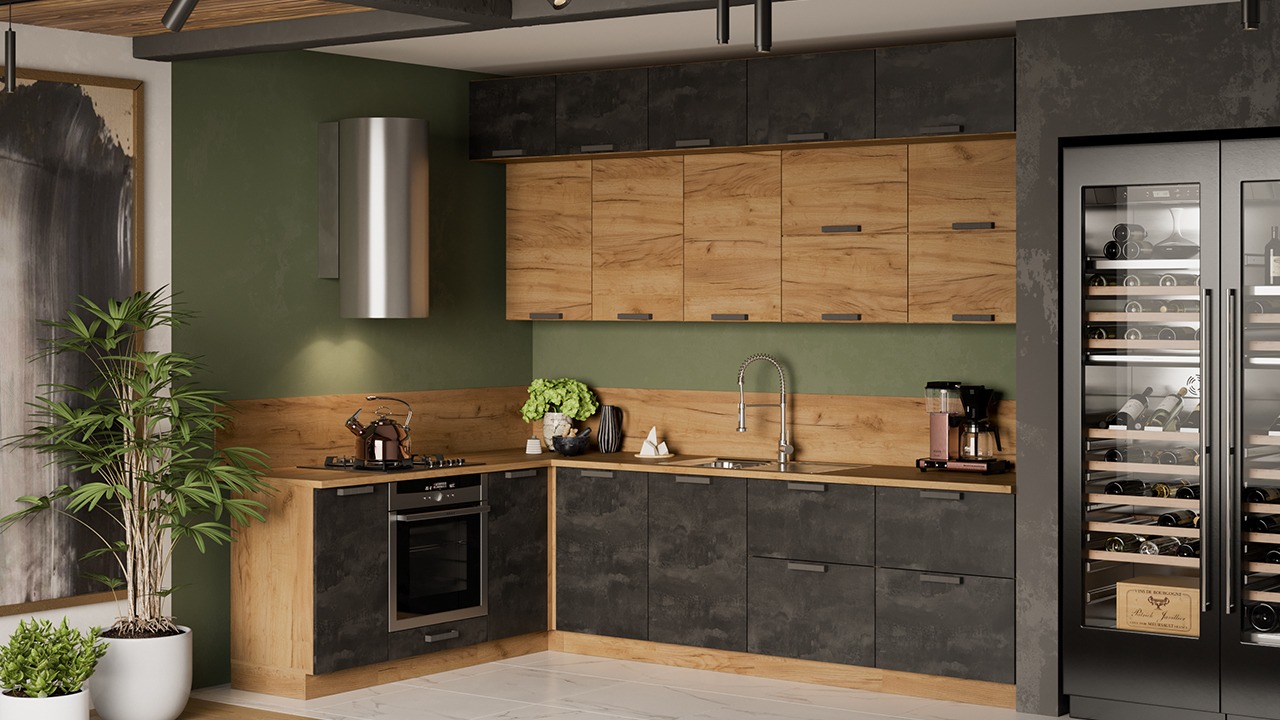 | Оттенок фасадаКоричневый, Черный | Цвет ручкиЧерный | Цвет фасадаДуб Крафт золотой, Угольный Камень |