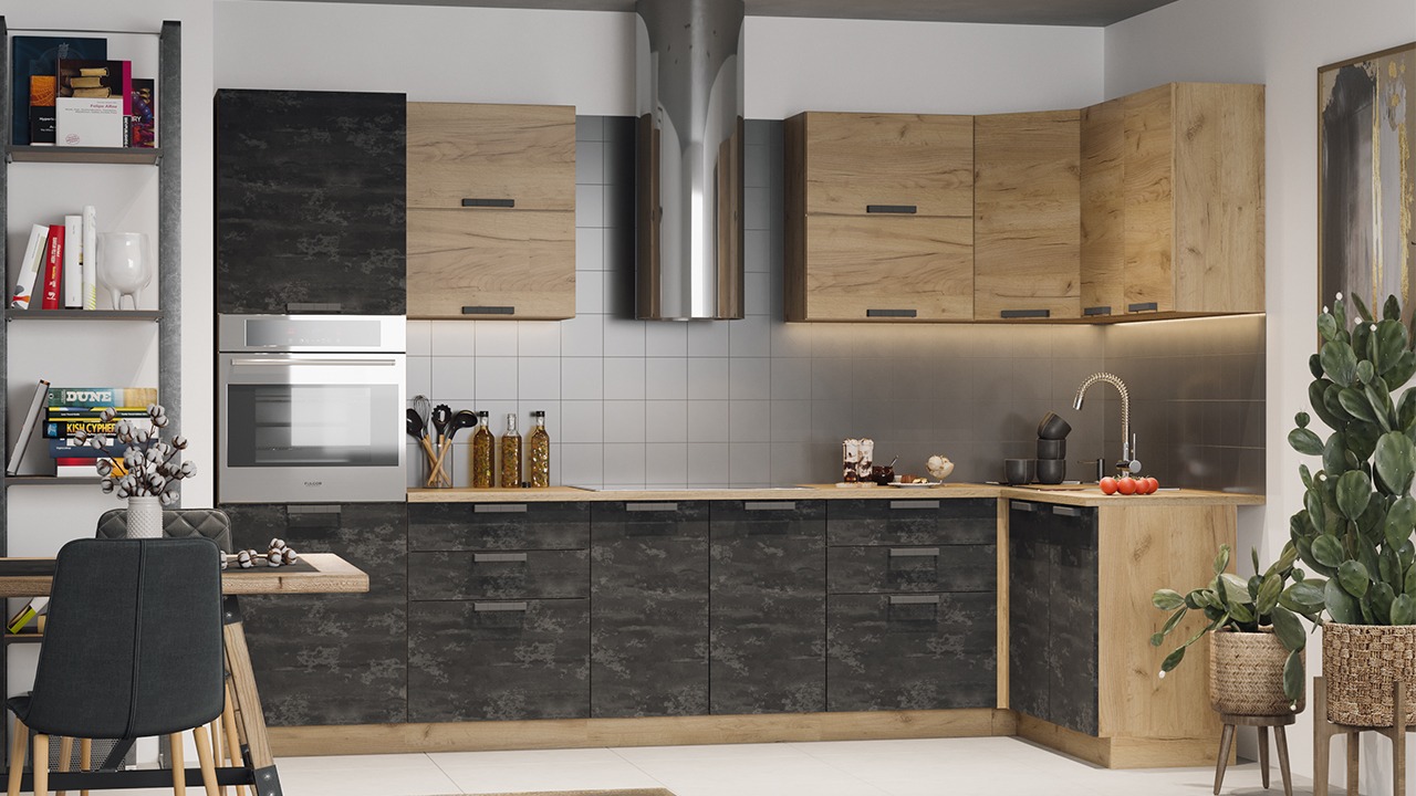 | Оттенок фасадаКоричневый, Черный | Цвет ручкиЧерный | Цвет фасадаДуб Крафт золотой, Угольный Камень |