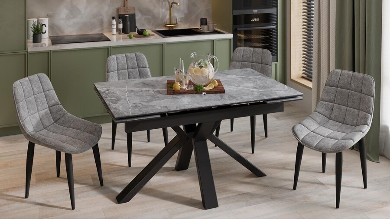 «Дерби» Тип 1 – стильный обеденный стол с керамогранитом, который преобразит любое помещение своим сдержанным видом, строгие и четкие линии подчеркивают элегантный стиль модели. Великолепный образ столу придает строгая по геометрии икс-образная опора, она выделяется своей уникальностью и придает оригинальный вид изделию.