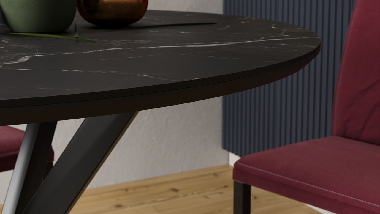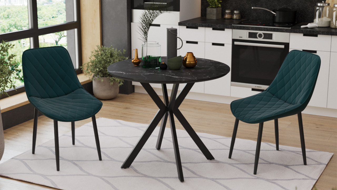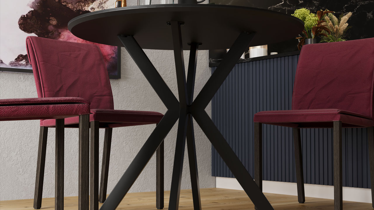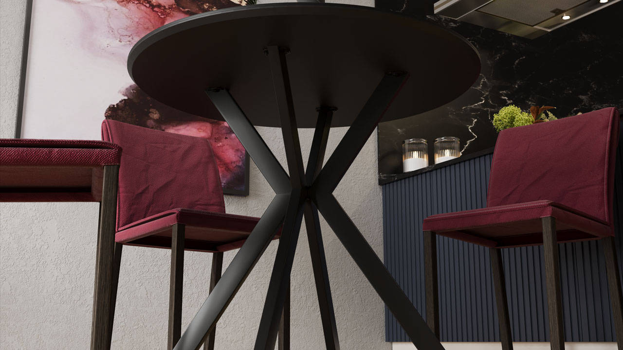 Материалы. Нераздвижная столешница изготовлена из МДФ 16 мм и керамогранита 6 мм. Керамогранит отличается высокой прочностью, долговечностью, надежностью и термостойкостью. Он не требует особого ухода и не подвержен повреждениям при регулярном использовании. Яркая особенность — это опоры из металла, которые смотрятся привлекательно и стильно. Ножки окрашены порошковой краской в цвете «Черный муар».