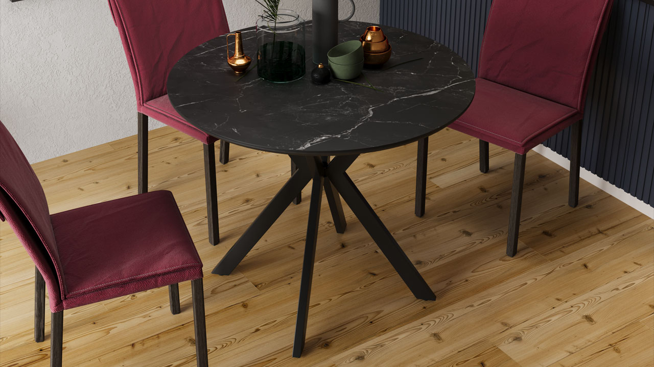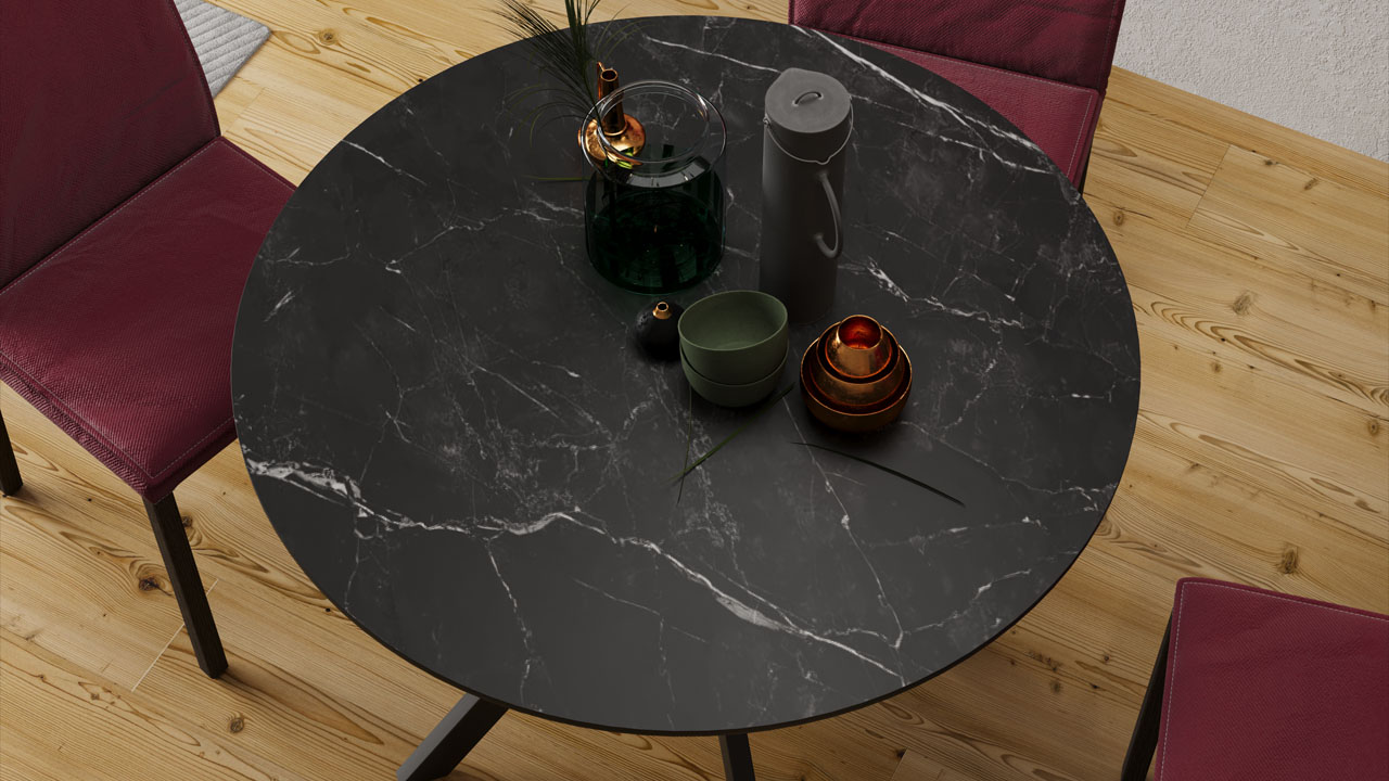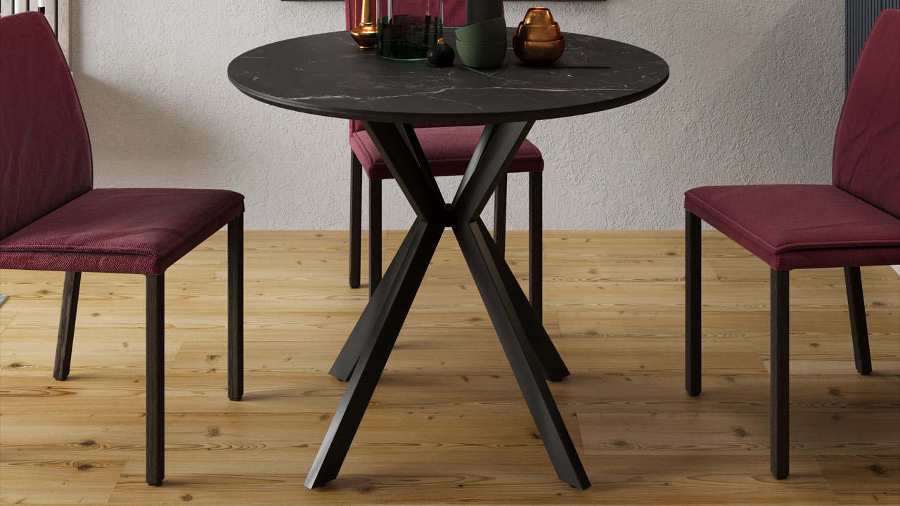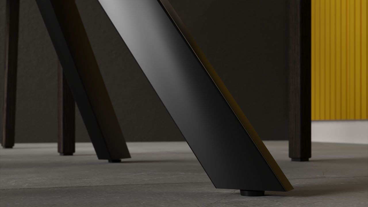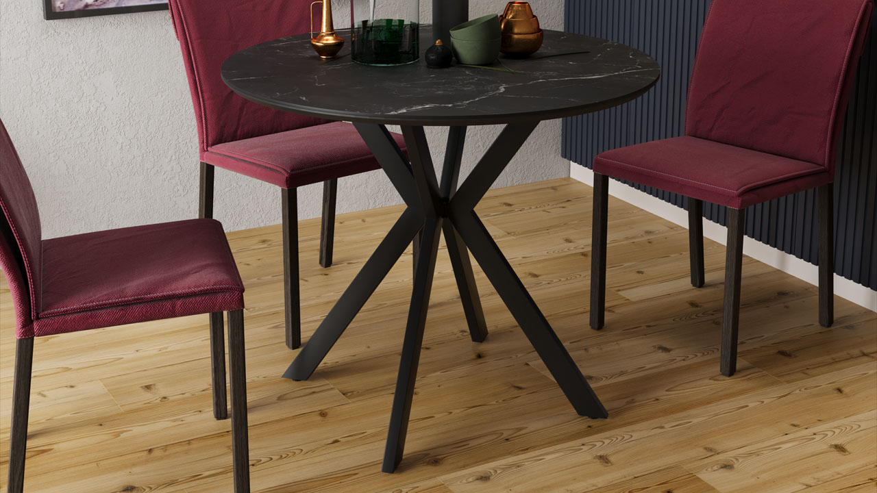 Материалы. Нераздвижная столешница изготовлена из МДФ 16 мм и керамогранита 6 мм. Керамогранит отличается высокой прочностью, долговечностью, надежностью и термостойкостью. Он не требует особого ухода и не подвержен повреждениям при регулярном использовании. Яркая особенность — это опоры из металла, которые смотрятся привлекательно и стильно. Ножки окрашены порошковой краской в цвете «Черный муар».
