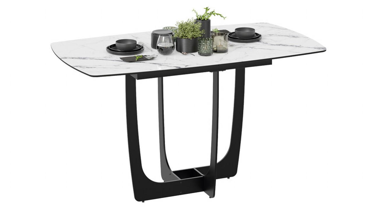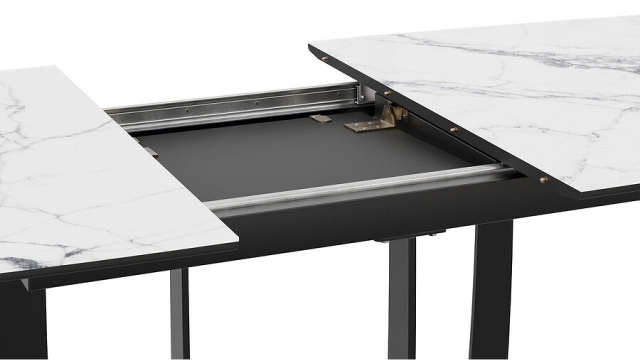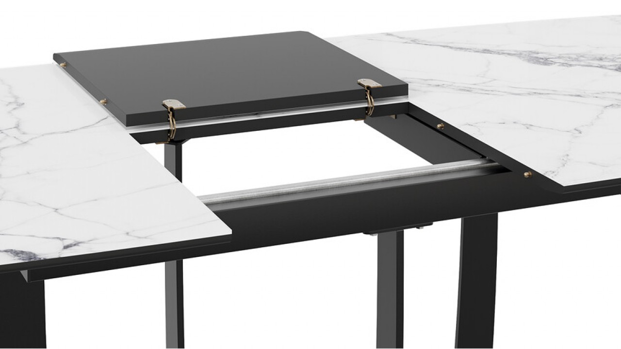 Современное цветовое оформление. Разнообразие актуальных цветовых исполнений позволяет приобрести модель исходя из индивидуальных предпочтений каждого потребителя, подобрав мебель на любой вкус и цвет. Новинка представлена в декорах с глянцевой белой и черной столешницей, с рисунком «под мрамор», которые воплощают роскошь современных модных тенденций, а столешница со стеклом «оникс» выражает благородство и безупречность. Вставка изготовлена со стеклом, на которой продолжается рисунок декора, что позволяет столу не терять эстетической окраски даже в разложенном варианте, делая образ изделия целостным и завершенным.