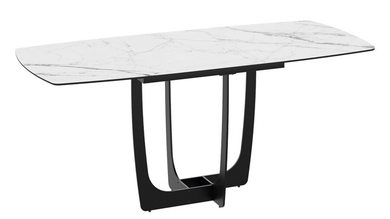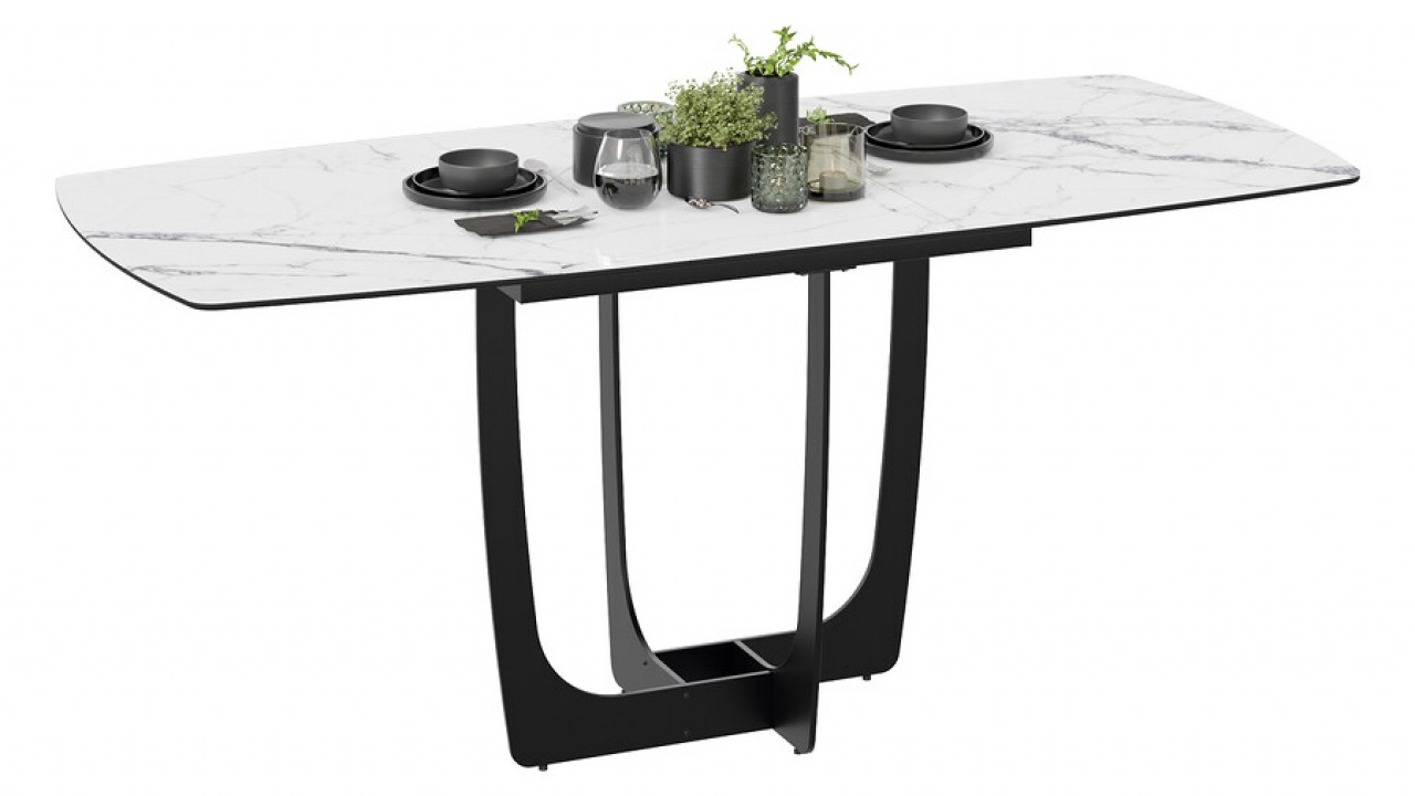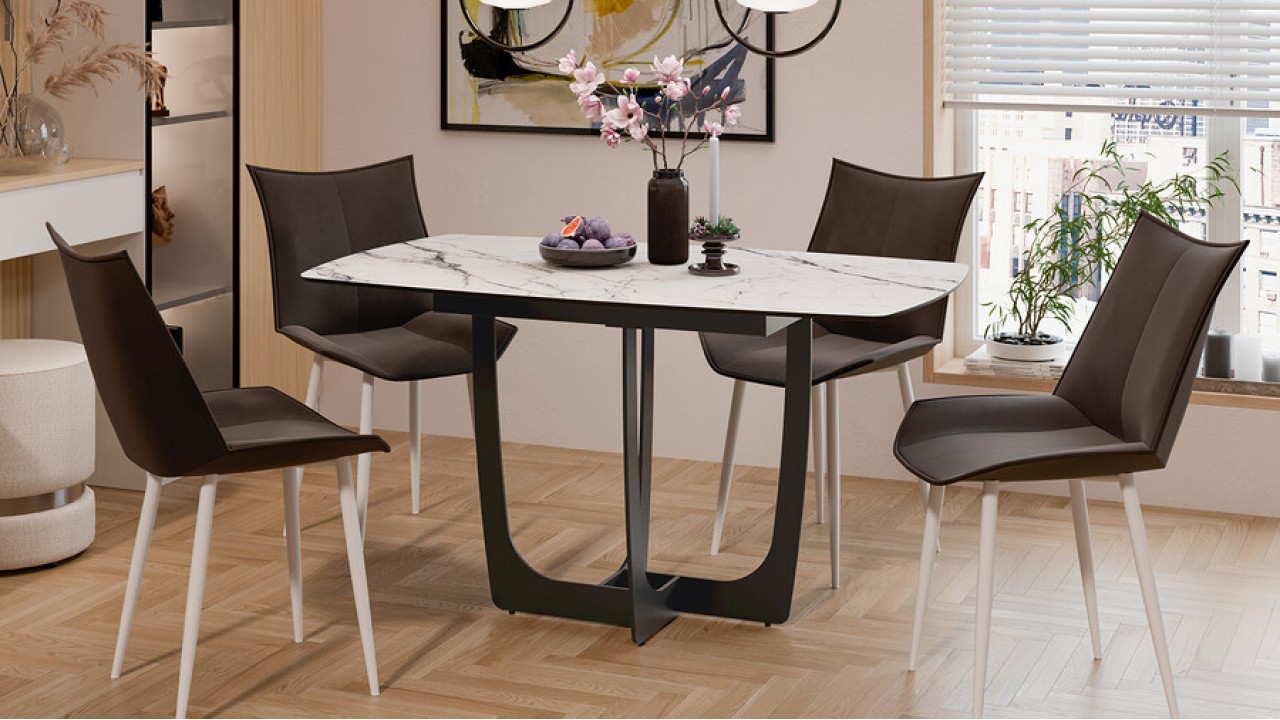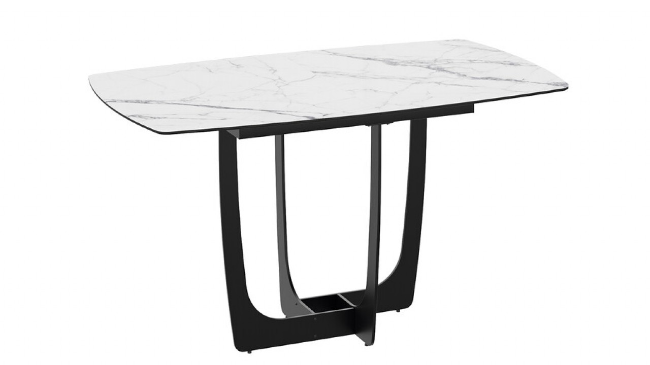 Современное цветовое оформление. Разнообразие актуальных цветовых исполнений позволяет приобрести модель исходя из индивидуальных предпочтений каждого потребителя, подобрав мебель на любой вкус и цвет. Новинка представлена в декорах с глянцевой белой и черной столешницей, с рисунком «под мрамор», которые воплощают роскошь современных модных тенденций, а столешница со стеклом «оникс» выражает благородство и безупречность. Вставка изготовлена со стеклом, на которой продолжается рисунок декора, что позволяет столу не терять эстетической окраски даже в разложенном варианте, делая образ изделия целостным и завершенным.