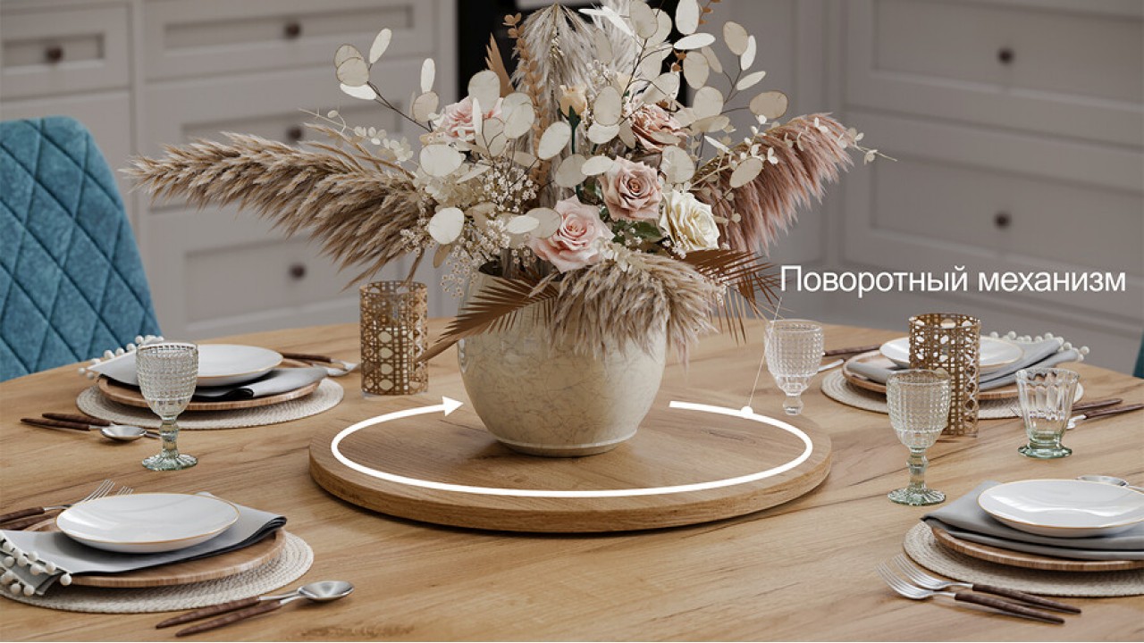 Функциональность. Модель оснащена вращающейся крышкой с поворотным механизмом для стильной сервировки и удобной подачи блюд. Центральная часть вращается только в одну сторону - по часовой стрелке.