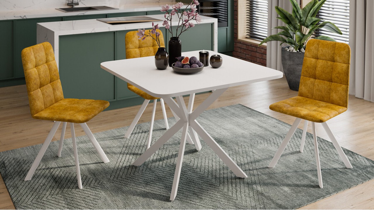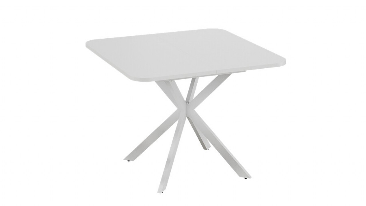 Стильный дизайн. Квадратный обеденный стол на перекрещенных ножках смотрится стильно, лаконично и ненавязчиво в любом интерьере. Столешница выполнена из ЛДСП 22 мм. Яркая особенность — оригинальная форма столешницы и опоры из металла, которые смотрятся привлекательно и современно. Ножки окрашены порошковой краской в цвета «Белый муар» и «Черный муар».