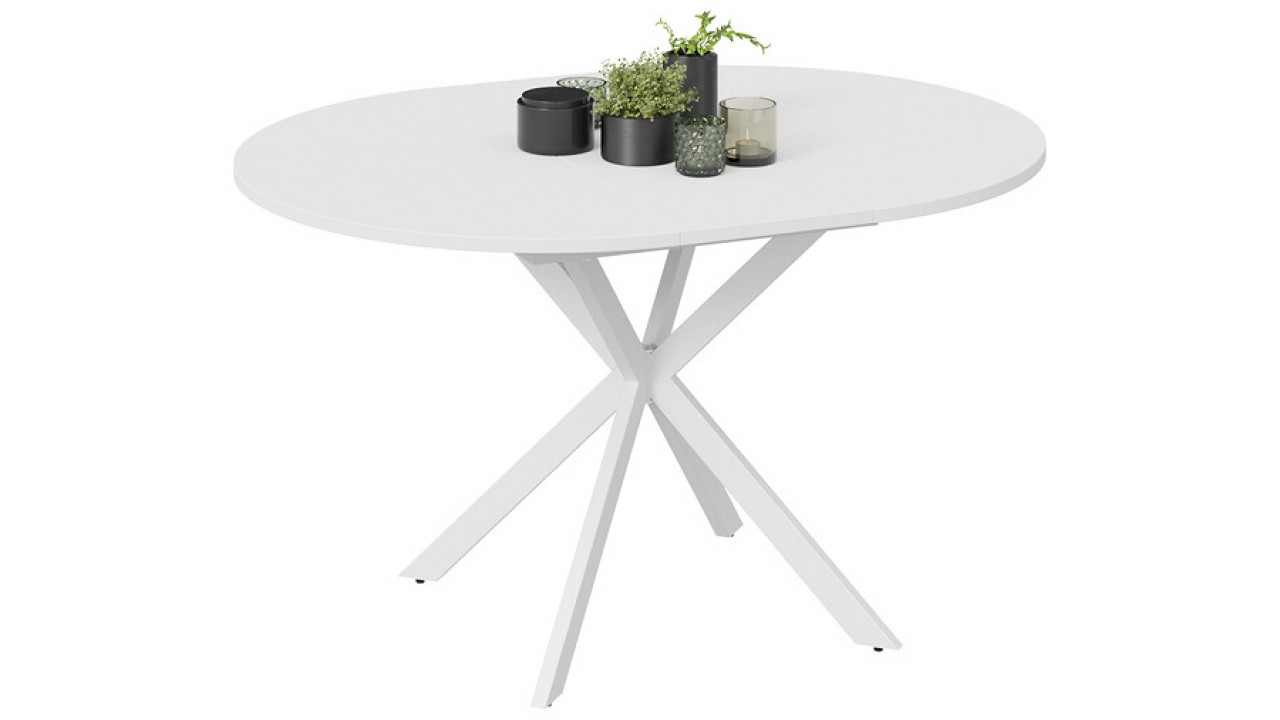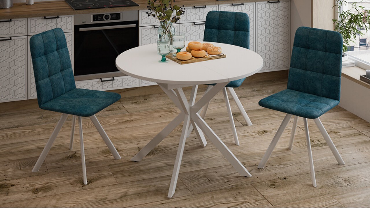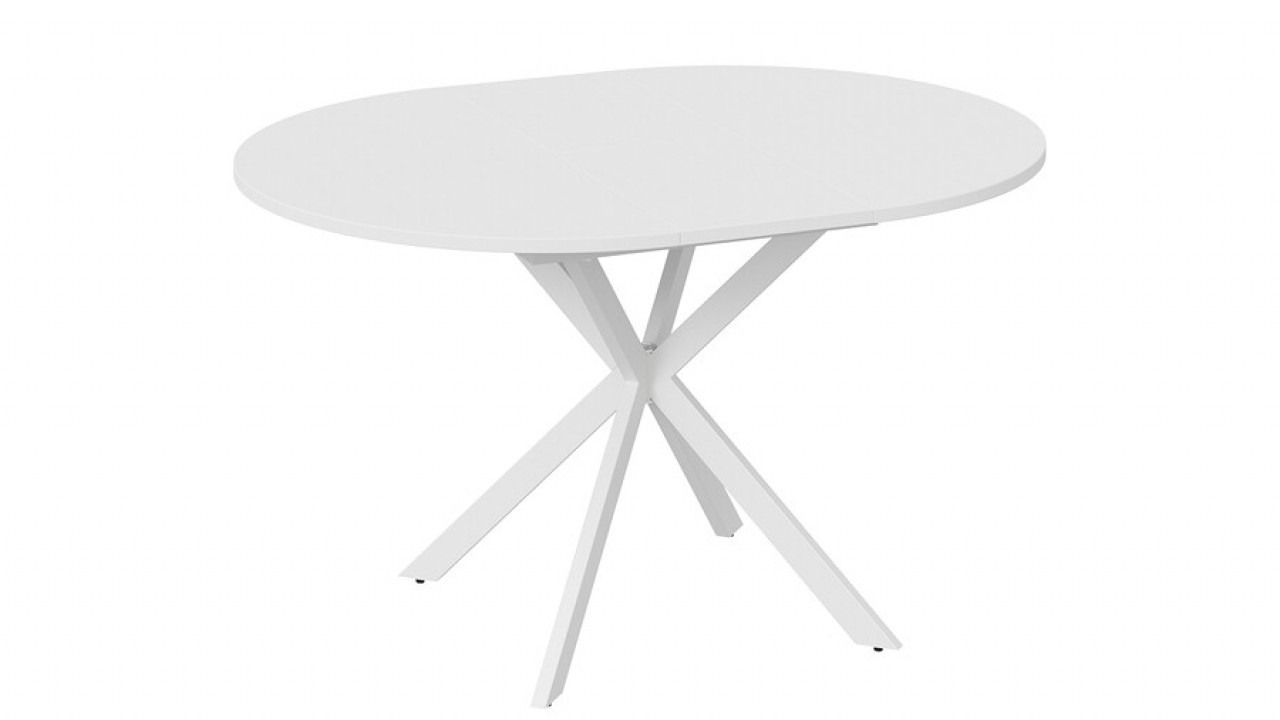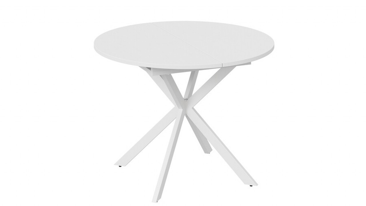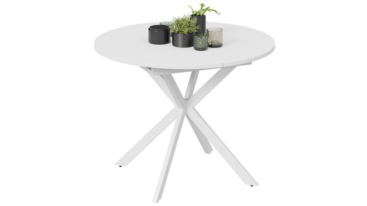 Стильный дизайн. Круглый обеденный стол на перекрещенных ножках смотрится изящно, лаконично и ненавязчиво в любом интерьере. Столешница выполнена из ЛДСП 22 мм. Яркая особенность — это опоры из металла, которые смотрятся привлекательно и стильно. Ножки окрашены порошковой краской в цвета «Белый муар» и «Черный муар».