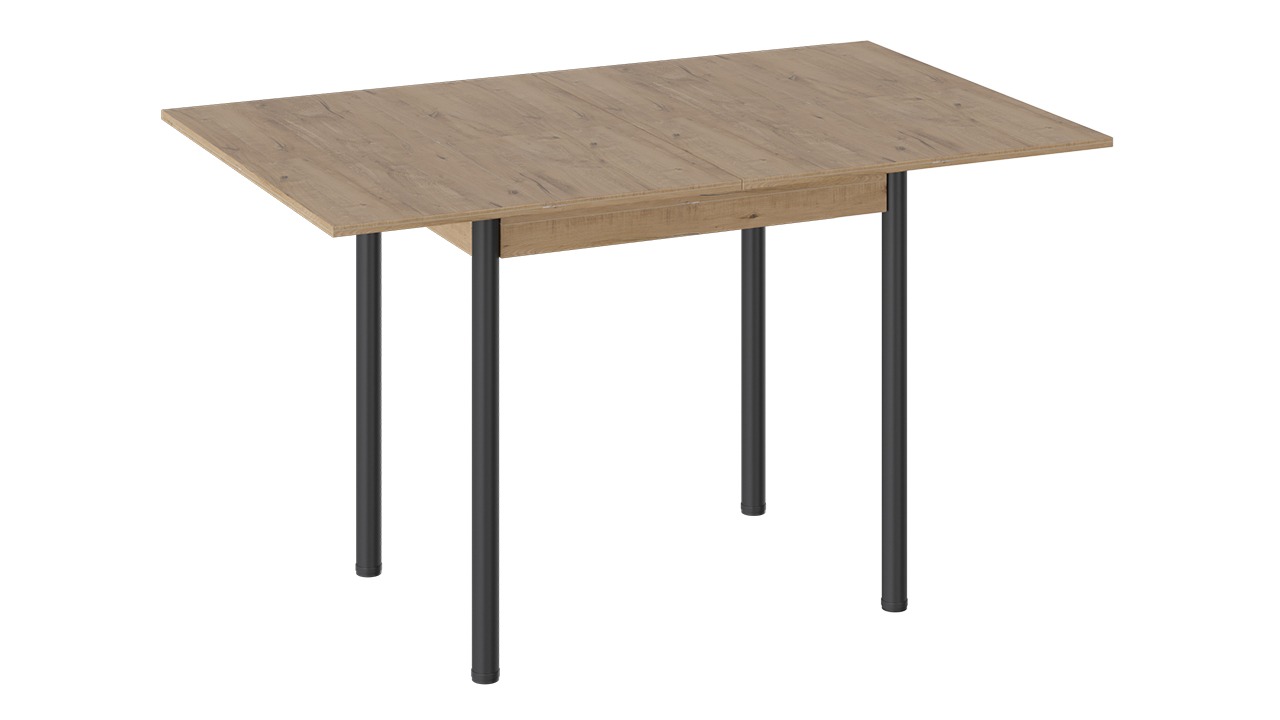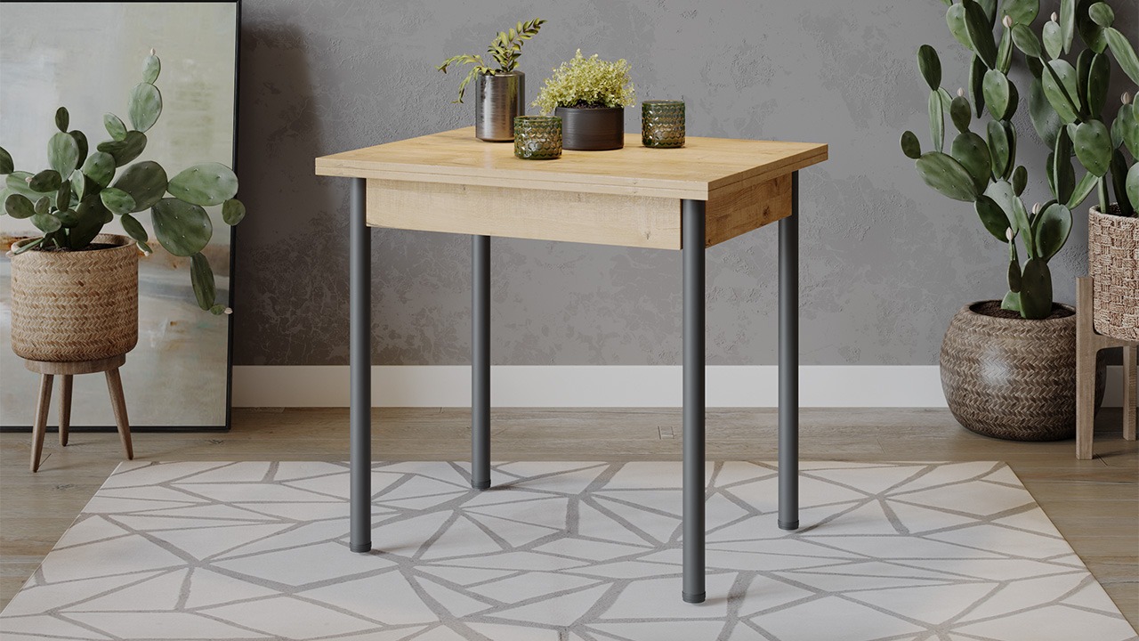 Функциональность. Модель имеет поворотно-раскладной механизм трансформации. В случае прихода гостей длина стола увеличивается вдвое: для этого нужно развернуть столешницу на 90 градусов и опустить верхнее крыло.