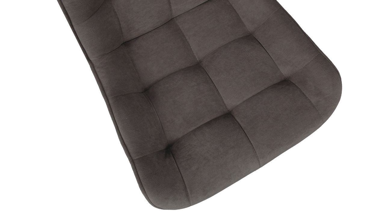 Материал исполнения. Обивка сиденья и спинки выполнена из велюра, который имеет приятную бархатистую поверхность и обладает хорошей износостойкостью и долговечностью. Оттенки обивки отражают все свежие и современные веяния мебельного рынка. Сочетание естественной фактуры мрамора с мягкой тактильной поверхностью велюра, подчеркнутой сложными природными оттенками, создает интересный образ коллекции. Разнообразная цветовая гамма и благородная текстура материала хорошо гармонирует со многими стилями интерьера. Фактура обивки выглядит еще выразительнее за счет декоративной простежки квадратами на фронтальной поверхности чехла. Надежная опора — это металлические ножки с порошковым покрытием. Они расставлены под углом, что гарантирует максимальную устойчивость конструкции. Каркас окрашен в цвета «Белый муар» и «Черный муар», которые сейчас очень популярны. На ножках предусмотрены пластиковые заглушки, которые придают стулу дополнительную устойчивость и защищают пол от царапин.