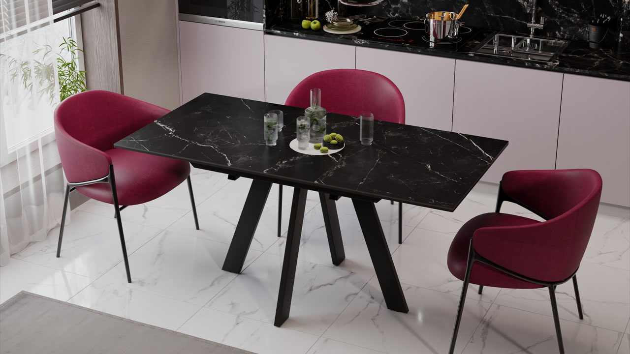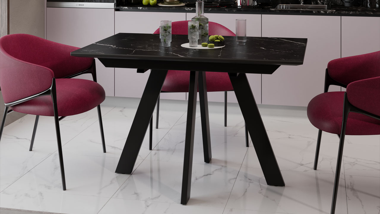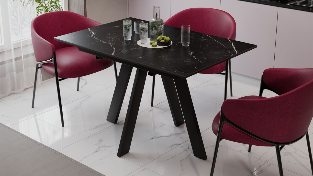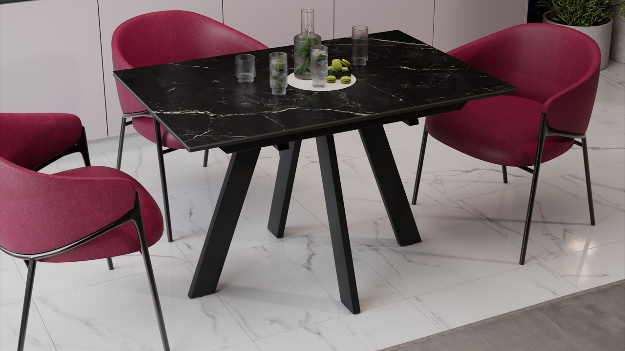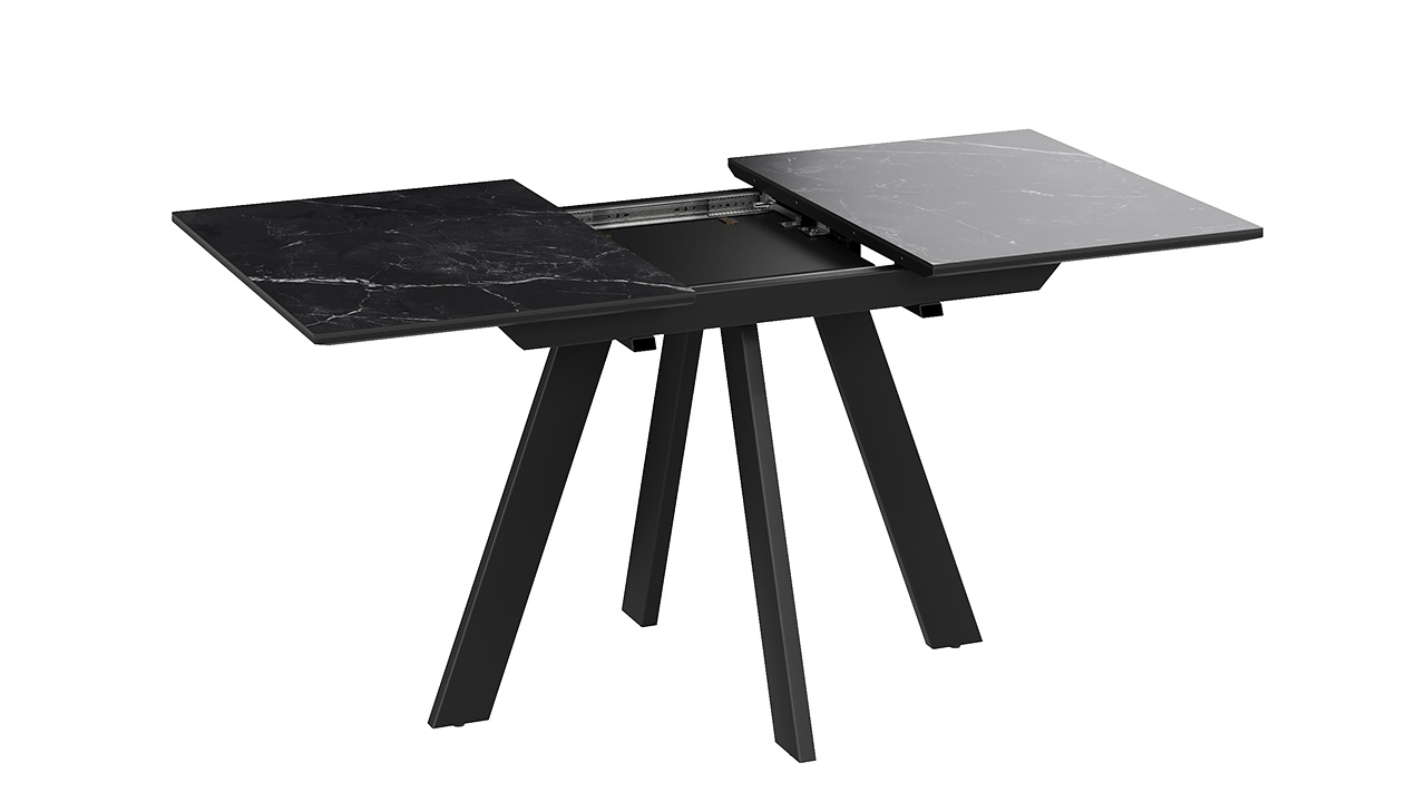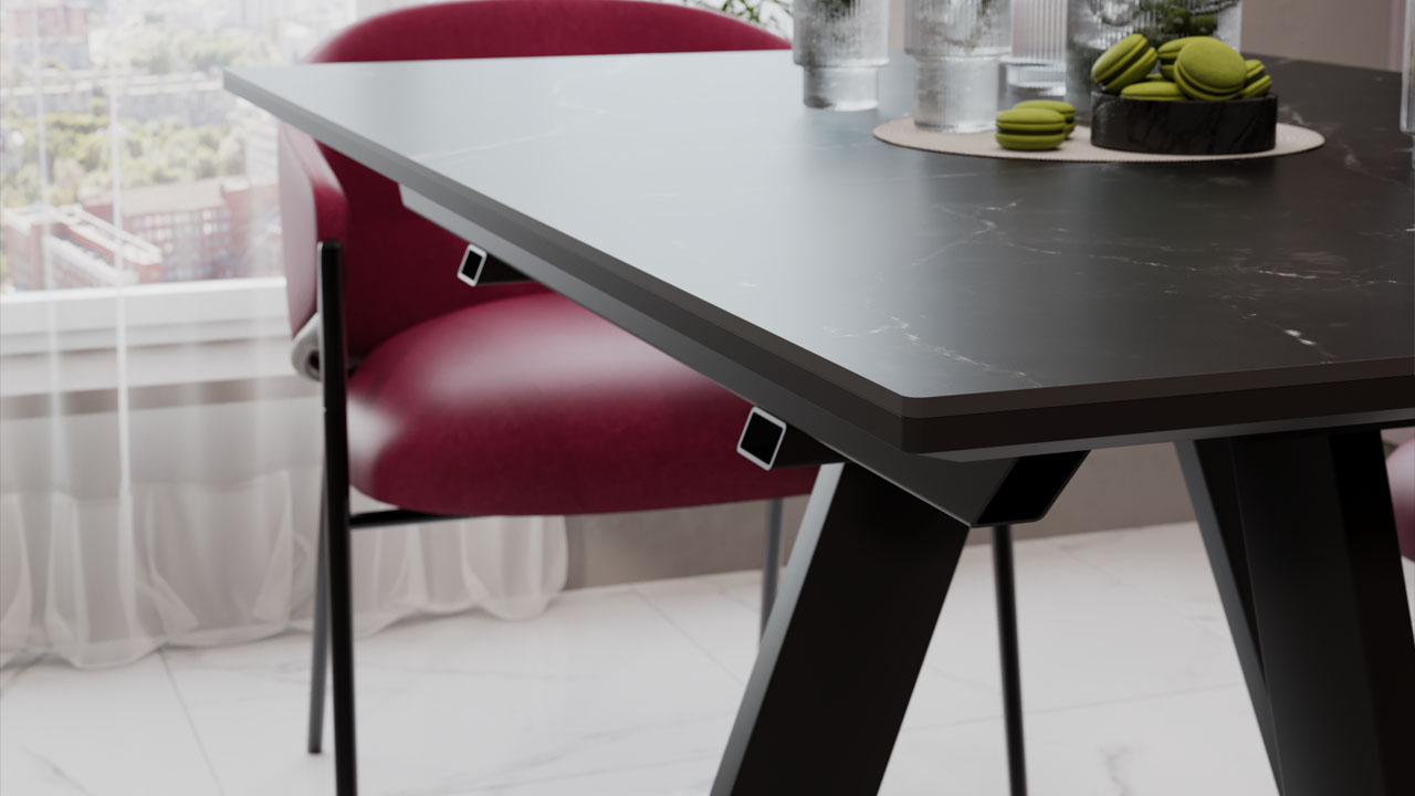 Материалы. Раздвижная столешница изготовлена из МДФ 22 мм и керамогранита 6 мм. Керамогранит отличается высокой прочностью, долговечностью, надежностью и термостойкостью. Он не требует особого ухода и не подвержен повреждениям при регулярном использовании. Опоры и подстолье выполнены из металла и окрашены порошковой краской «Черный муар».