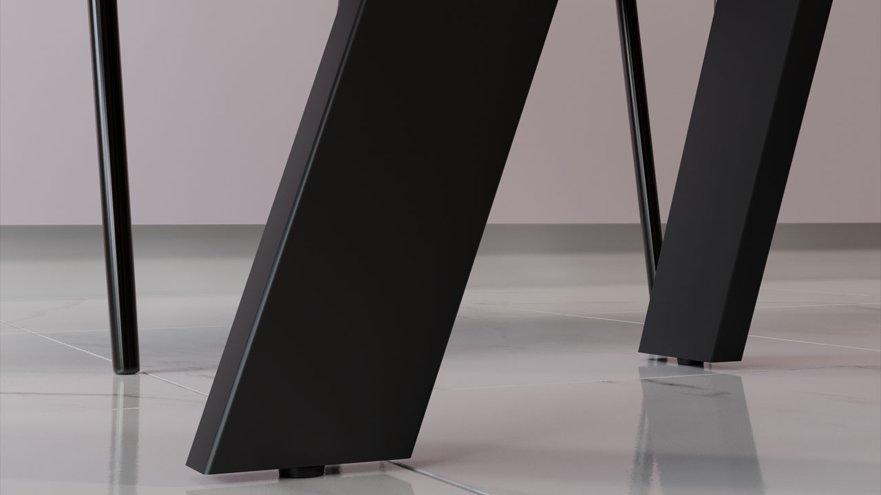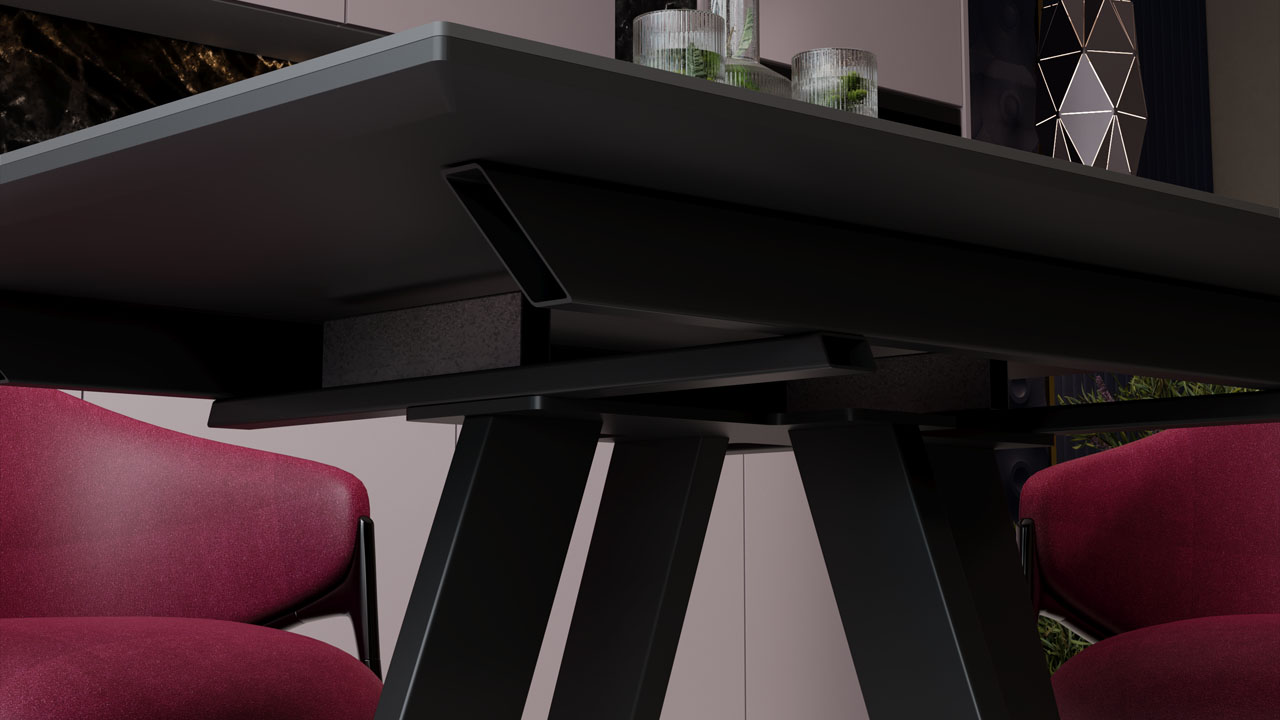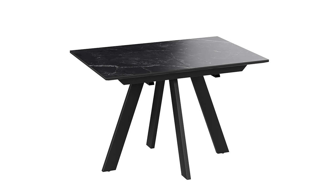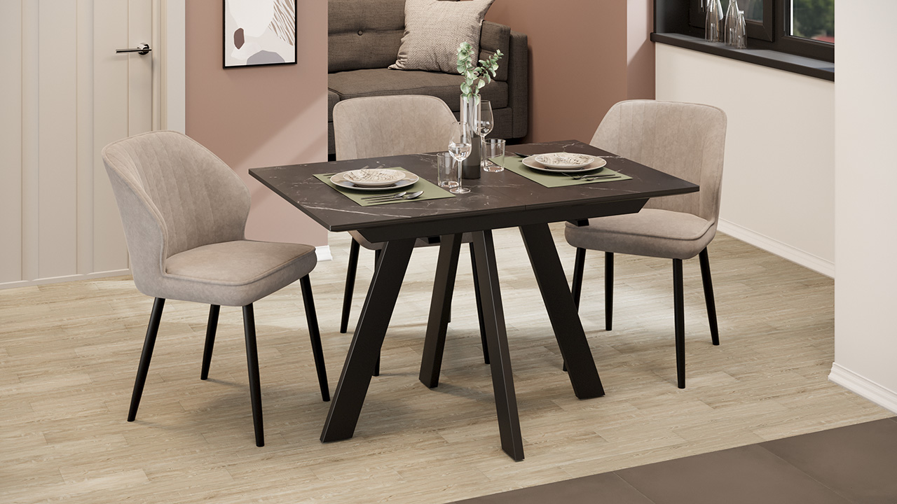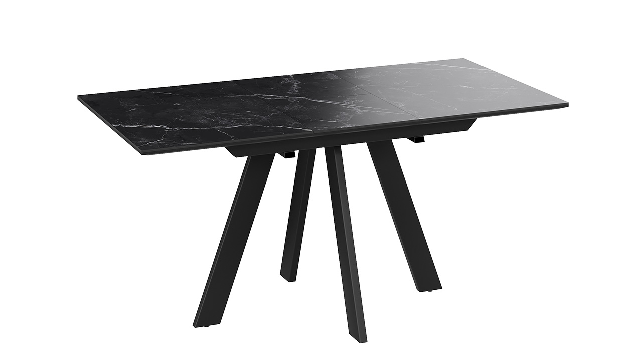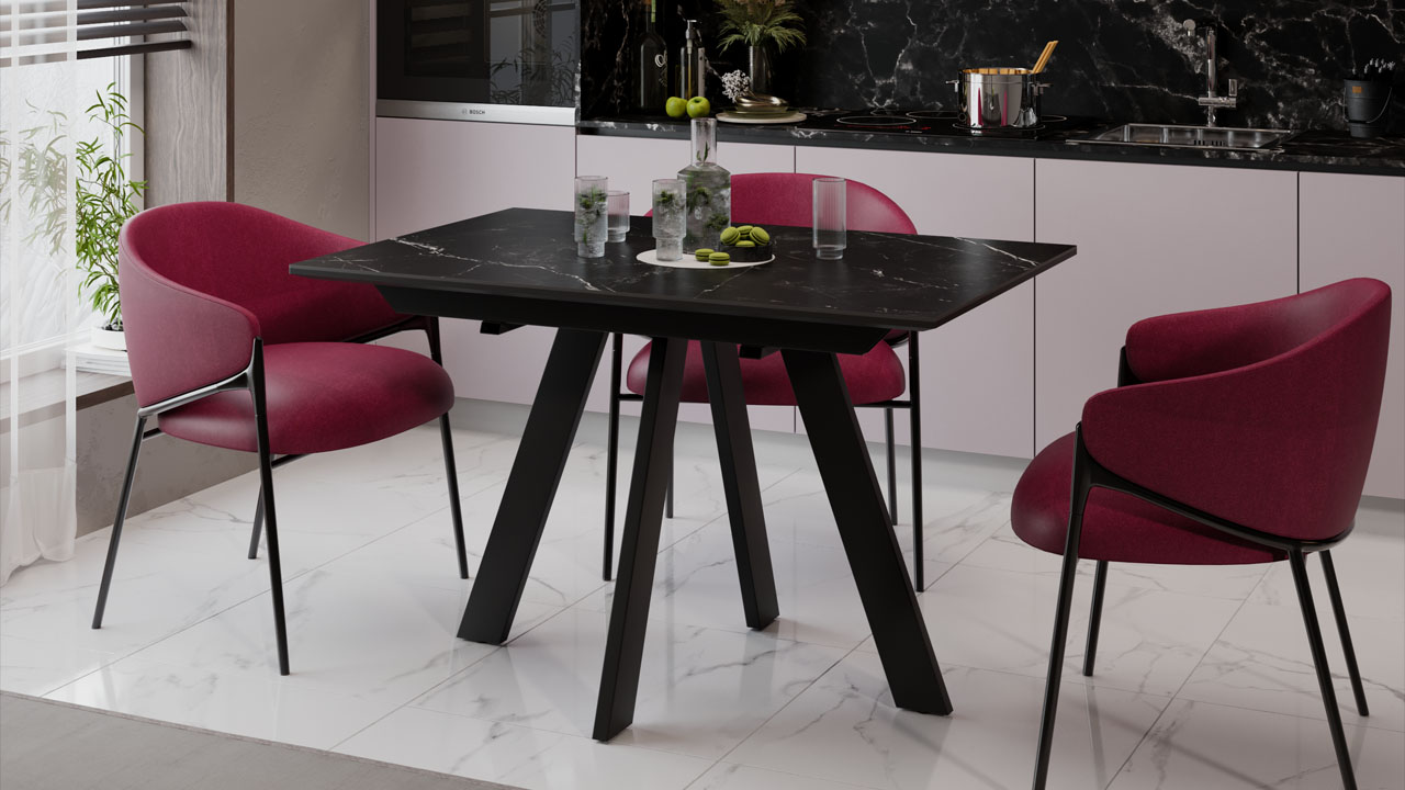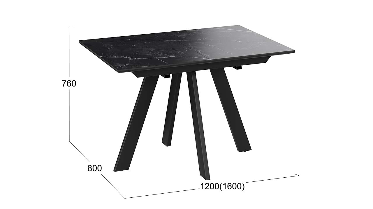 Материалы. Раздвижная столешница изготовлена из МДФ 22 мм и керамогранита 6 мм. Керамогранит отличается высокой прочностью, долговечностью, надежностью и термостойкостью. Он не требует особого ухода и не подвержен повреждениям при регулярном использовании. Опоры и подстолье выполнены из металла и окрашены порошковой краской «Черный муар».