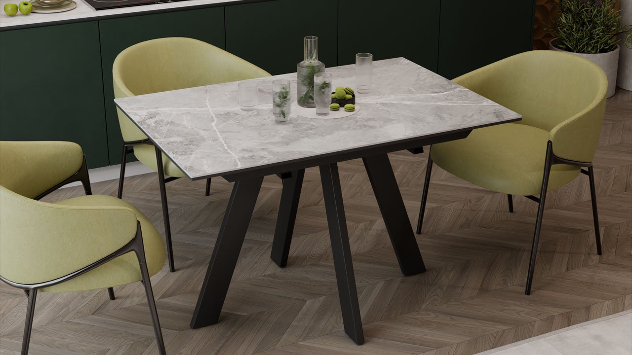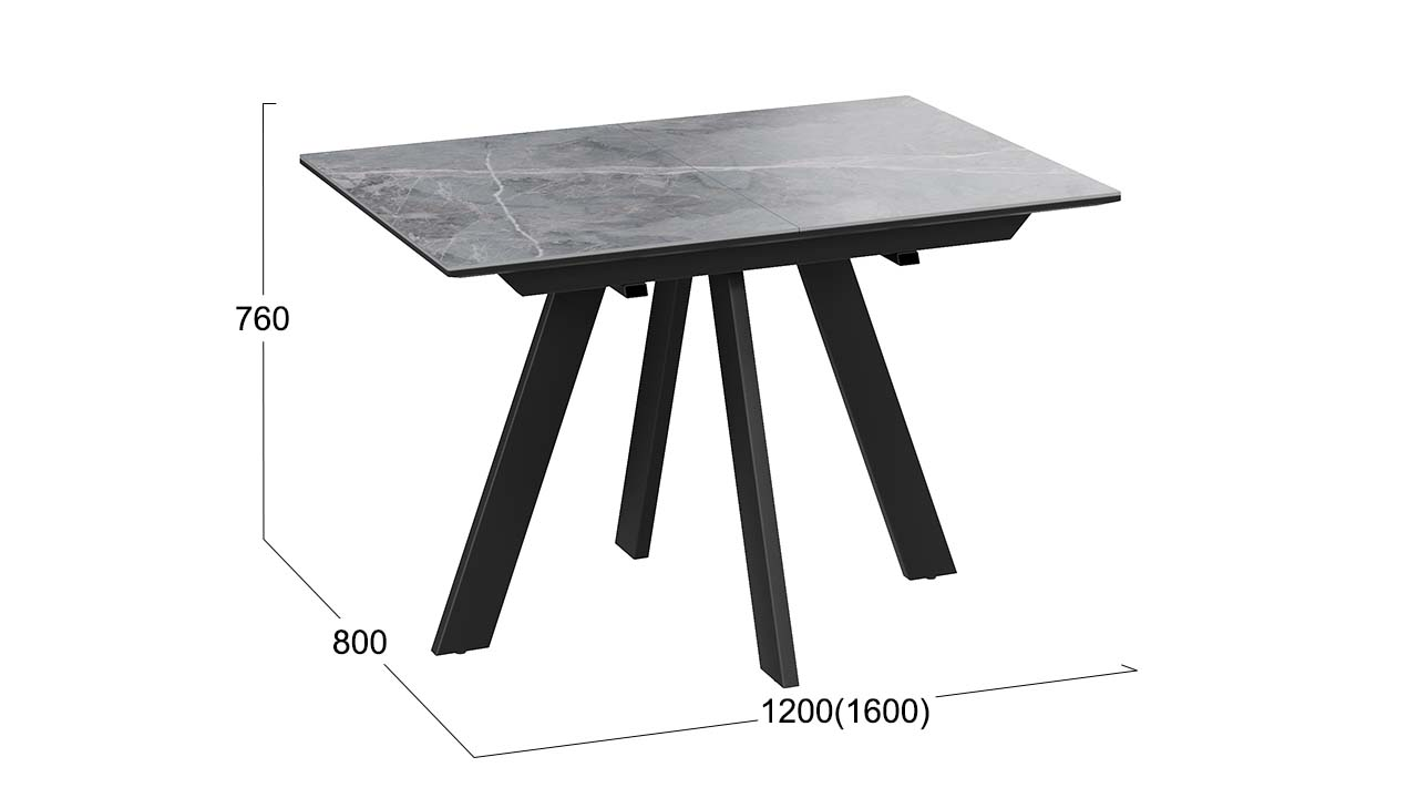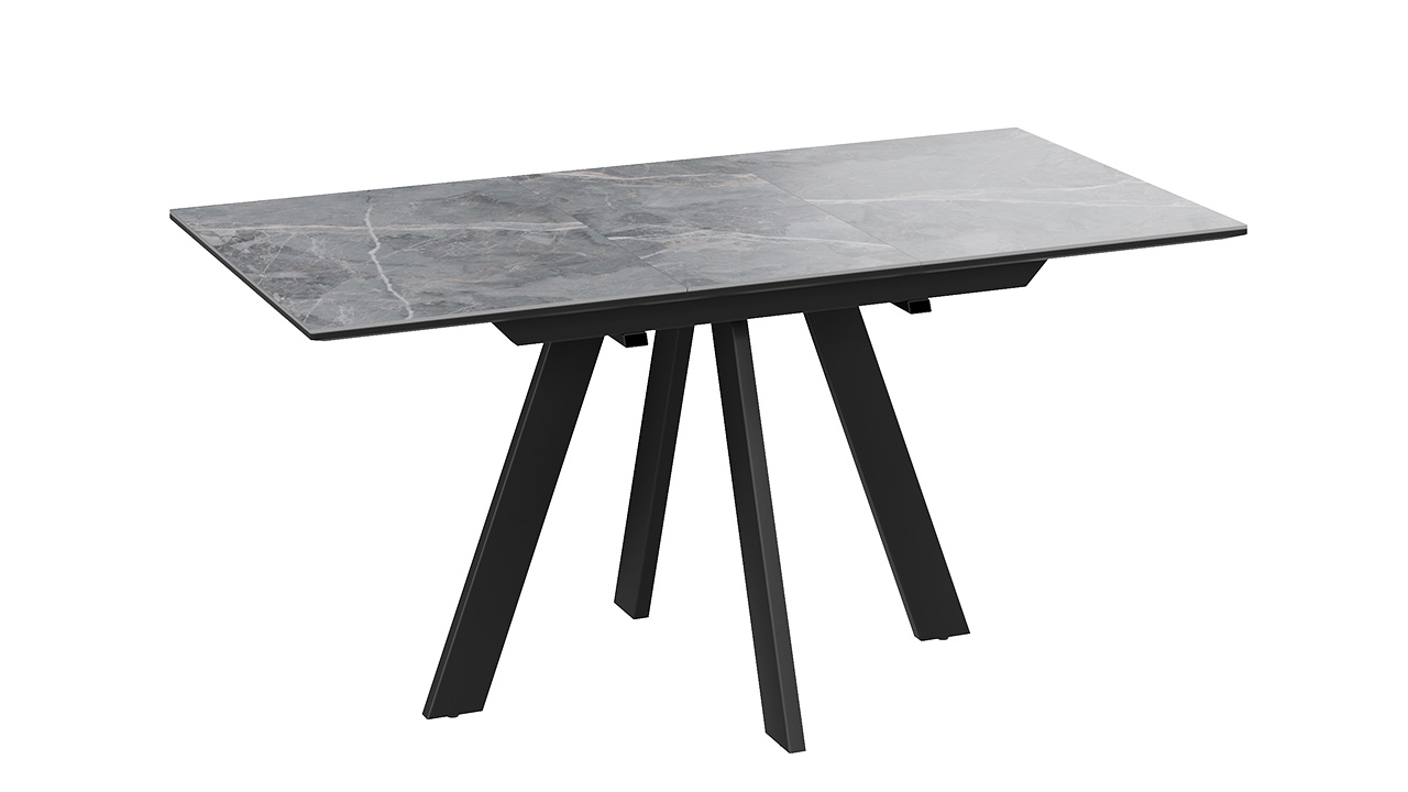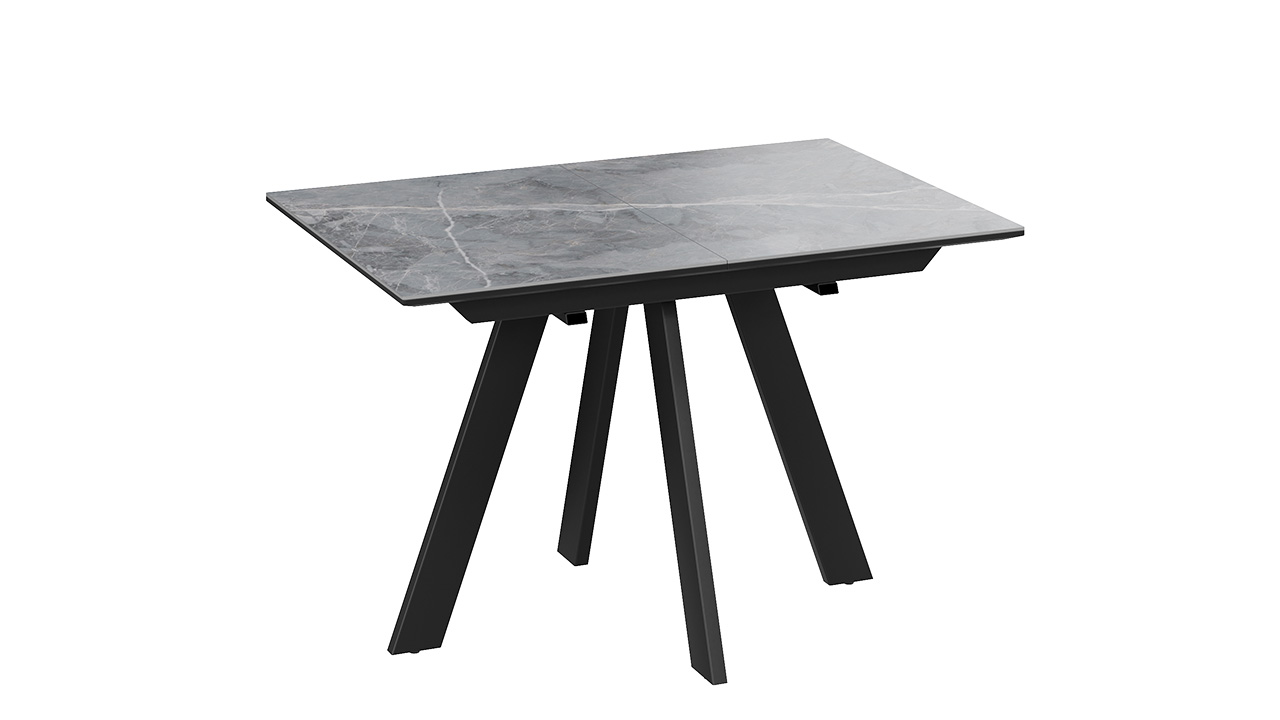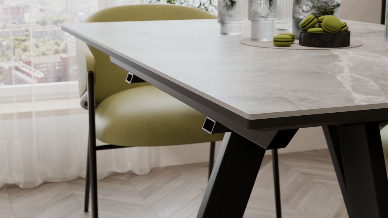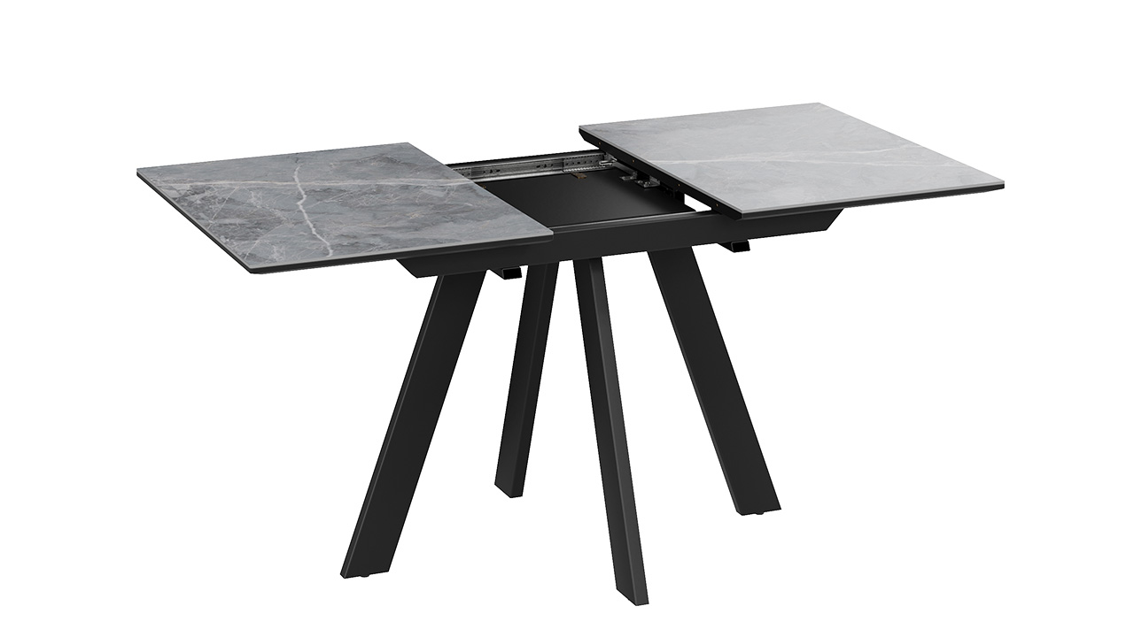 Материалы. Раздвижная столешница изготовлена из МДФ 22 мм и керамогранита 6 мм. Керамогранит отличается высокой прочностью, долговечностью, надежностью и термостойкостью. Он не требует особого ухода и не подвержен повреждениям при регулярном использовании. Опоры и подстолье выполнены из металла и окрашены порошковой краской «Черный муар».