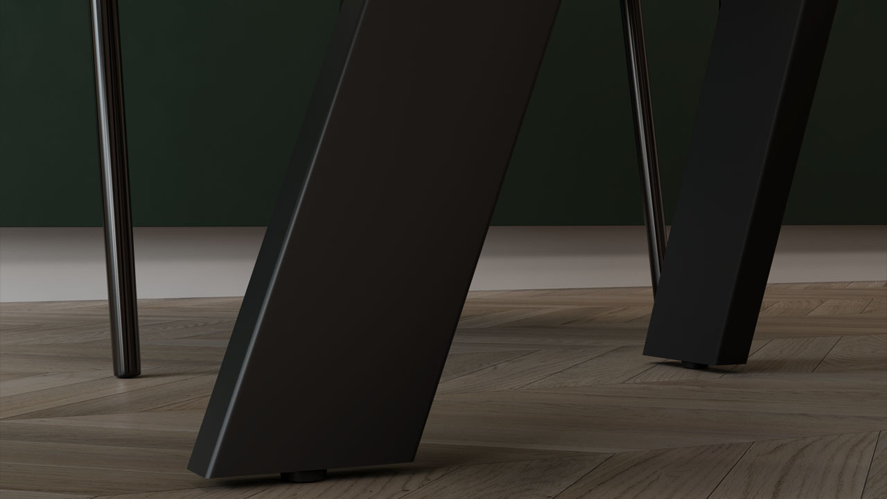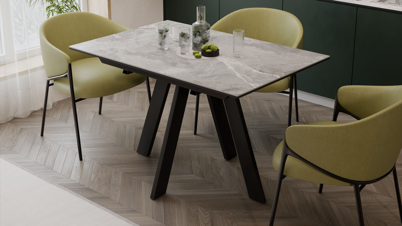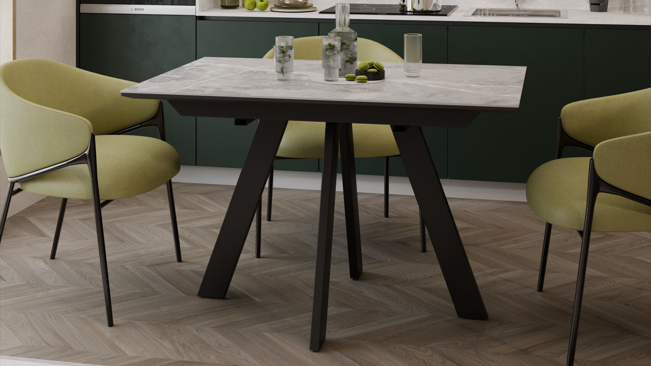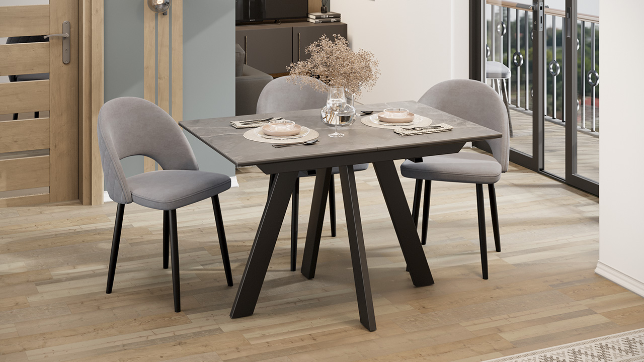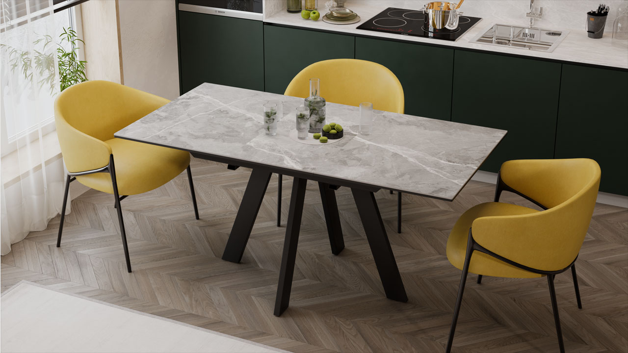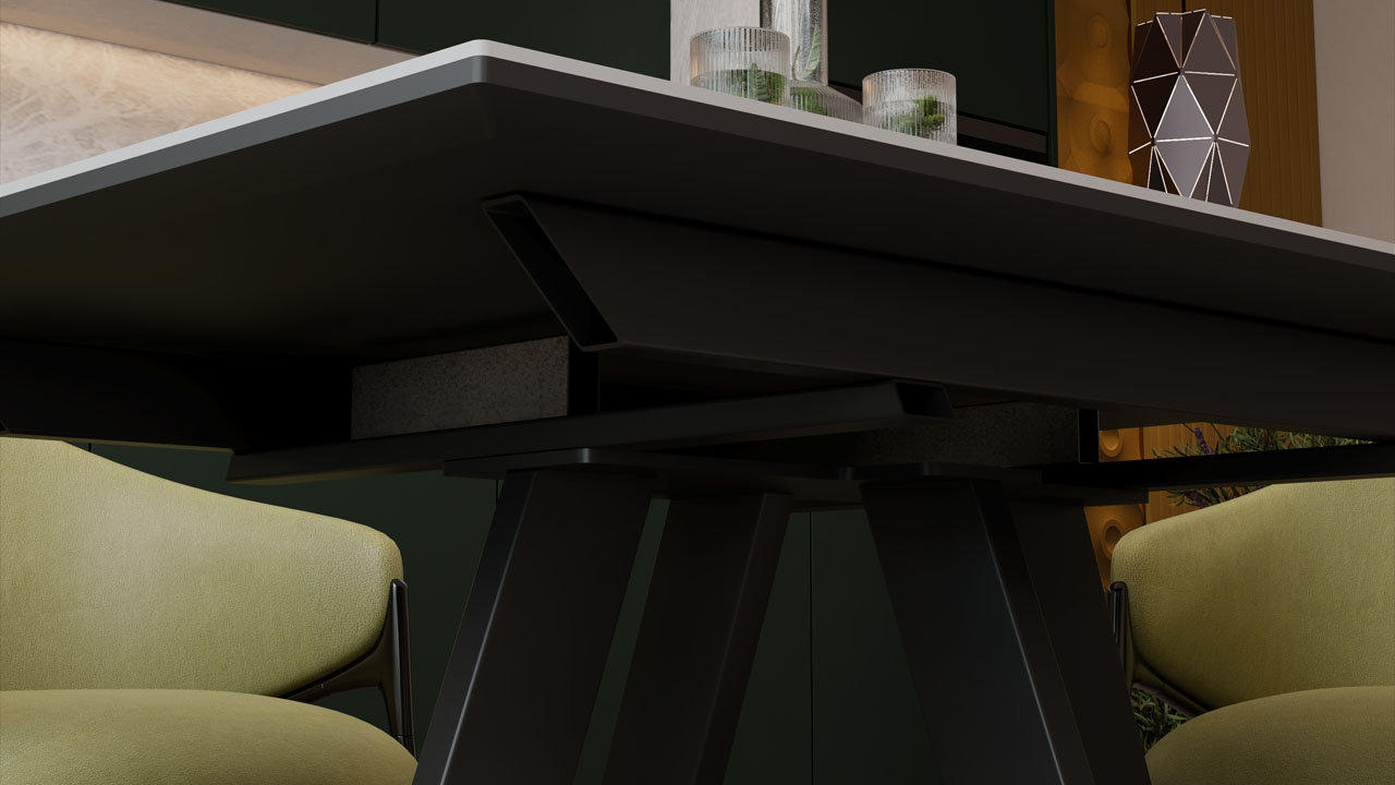 Материалы. Раздвижная столешница изготовлена из МДФ 22 мм и керамогранита 6 мм. Керамогранит отличается высокой прочностью, долговечностью, надежностью и термостойкостью. Он не требует особого ухода и не подвержен повреждениям при регулярном использовании. Опоры и подстолье выполнены из металла и окрашены порошковой краской «Черный муар».